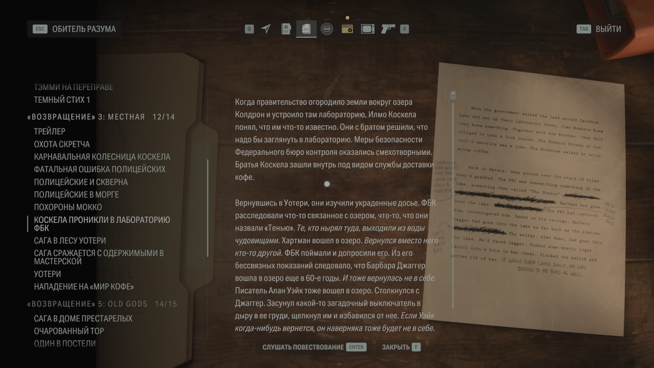Чуть позже Кейси признаётся Саге, что он не был с ней до конца честен и вызвался расследовать дело из-за произошедшего с ним в Нью-Йорке. Что это было — обычное умалчивание фактов или изменение реальности задним числом? Ведь Илмо Коскела при первой встрече с Сагой не узнаёт её — жительницей Уотери в его глазах она стала только после начала AWE. Мне теория очень нравится, хотя, скорее всего, воспоминание о расследовании в Нью-Йорке существовало в голове Кейси всегда — альтернативные события локальны, и им нужны время и сила, чтобы распространиться дальше, а документы о Кейси из Control подтверждают, что бюро знало о его расследовании.