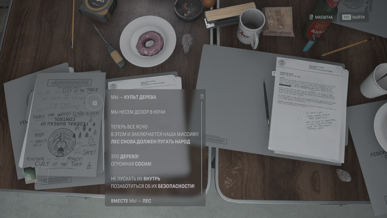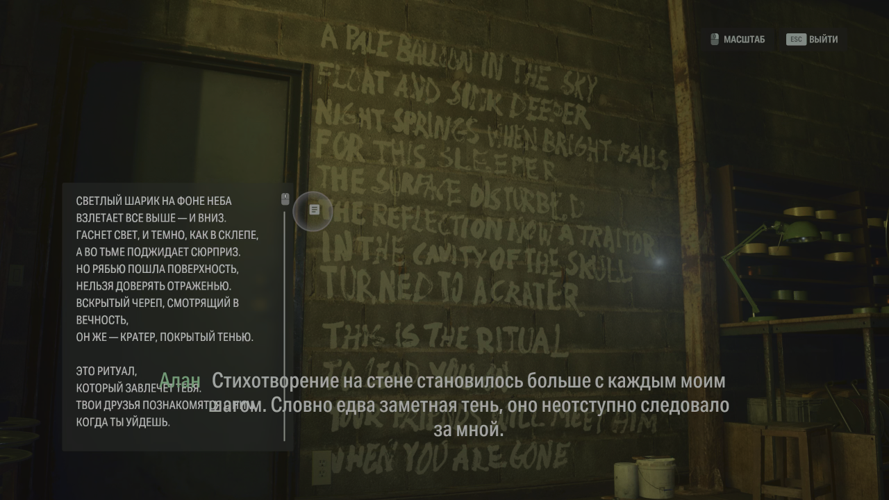 Напомню, что для открытия складки нужны два компонента — какое-нибудь мрачное убийство, легенда или история, а также произведение искусства. Сага, например, открыла складку у колодца Хуотари, куда по легенде маньяк сбрасывал трупы, а подкрепила свой ритуал выставочным стендом — тоже своего рода искусство. Алану в это же время предстояло идти по следам убийств культа, а проводником в складку ему служили стихи, начертанные в местах, которые соприкасались с реальным миром.