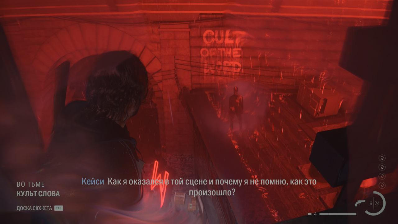 Это натолкнуло меня на мысль, что для заполнения пробелов в истории Тёмная обитель использует уже знакомые архетипы. Продажные копы, которые скрывают улики, оказались офицерами Торнтоном и Маллиганом, которых Сага встречает в Брайт-Фоллсе. Первая жертва — не безымянный агент ФБР, а сам Найтингейл, работавший в той же организации. А убитая актриса, служившая музой для главного героя спектакля, — Синтия. Хотя не исключено, что это Алан Уэйк, как параутилит, «заглядывал» в реальный мир за информацией, искал вдохновение и тем самым придавал глубины своим героям. Сам Кейси, правда, сильно отличается от своего прототипа: книжный Алекс — полицейский, а не агент, носит пёстрые галстуки, находит утешение в алкоголе и слишком сильно любит пафосные монологи.