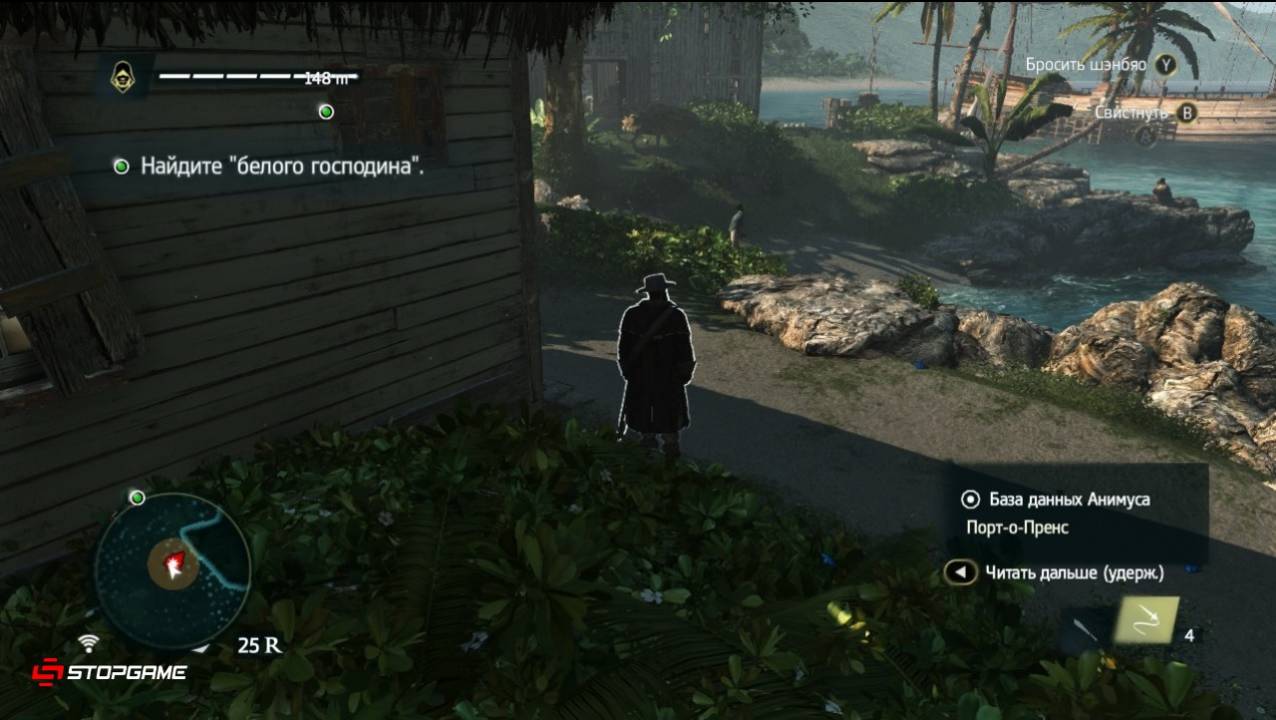 Адевале вместе с посылкой вынесло на берег острова. Наблюдаем за тем, как рабыня пытается сбежать от безжалостного надсмотрщика. Подбираем мачете и бросаемся в погоню. Расправляемся с врагом любым доступным способом. По-умолчанию у нас имеется шэнбяо – веревка с острым наконечником. Взбираемся на дерево, целимся в надсмотрщика и подвешиваем его орудием дальнего боя. После слов благодарности поинтересуемся, где мы можем найти Бастьенну Жозеф. Рабыня подскажет, что любой «белый господин» в городе приведет нас к ней.