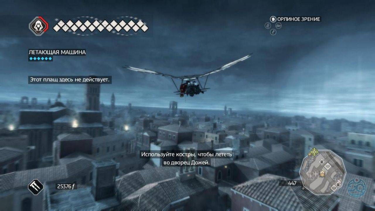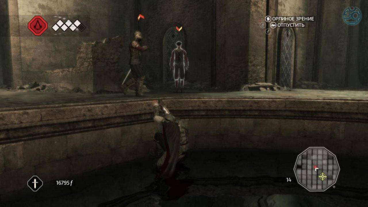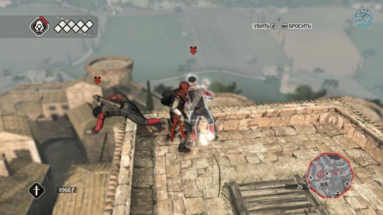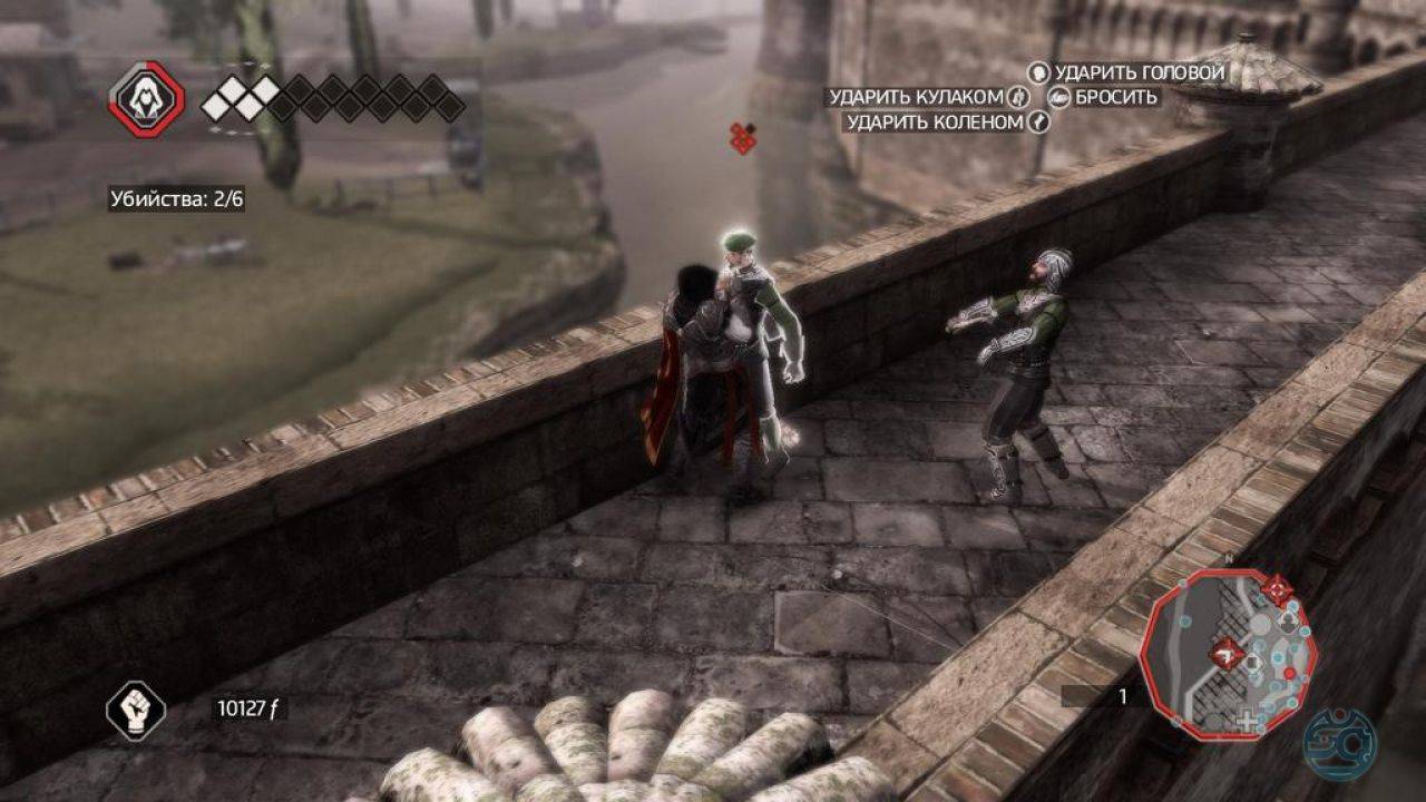 Глаза буквально разбегаются от всевозможных занятий для Эцио. Самое первое — поиск сокровищ. По всем землям, что мы посетим, разбросаны подарки — маленькие сундучки с денежными ништяками. Их три сотни с лишним. А еще есть сто орлиных перьев, которые валяются черт знает где. А еще тридцать страниц кодекса, восемь запрятанных статуэток, шесть гробниц ассасинов и двадцать зашифрованных посланий-загадок. Дух GTA, а ну ответь мне! Точек обзора тоже не кисло — более семидесяти. До старости одних только собирательных дел хватит, а ведь есть еще побочные задания: навалять люлей неверному мужу, который может оказаться танком в роскошных доспехах и с топором вполовину собственного роста; замочить нехорошего человека в сортире (мы же в роли убийцы!); доставить послание — обязательно на время, обязательно с акробатикой. А еще можно бегать наперегонки. И всего этого ну просто очень много. И, что еще важнее, этим не заставляют заниматься. И хорошо, что не заставляют, ибо к деятельности настоящего суперубийцы такие вещи отношение имеют, прямо скажем, весьма малое. Фальшивость только ушки показывает, но они всегда на виду, это грустно. С другой стороны — прощай, дурь Assassin's Creed, когда надо было до потери сознания выполнять три типа тупых заданий, чтобы активировать сюжет. Тут все можно сразу. Viva la liberté.