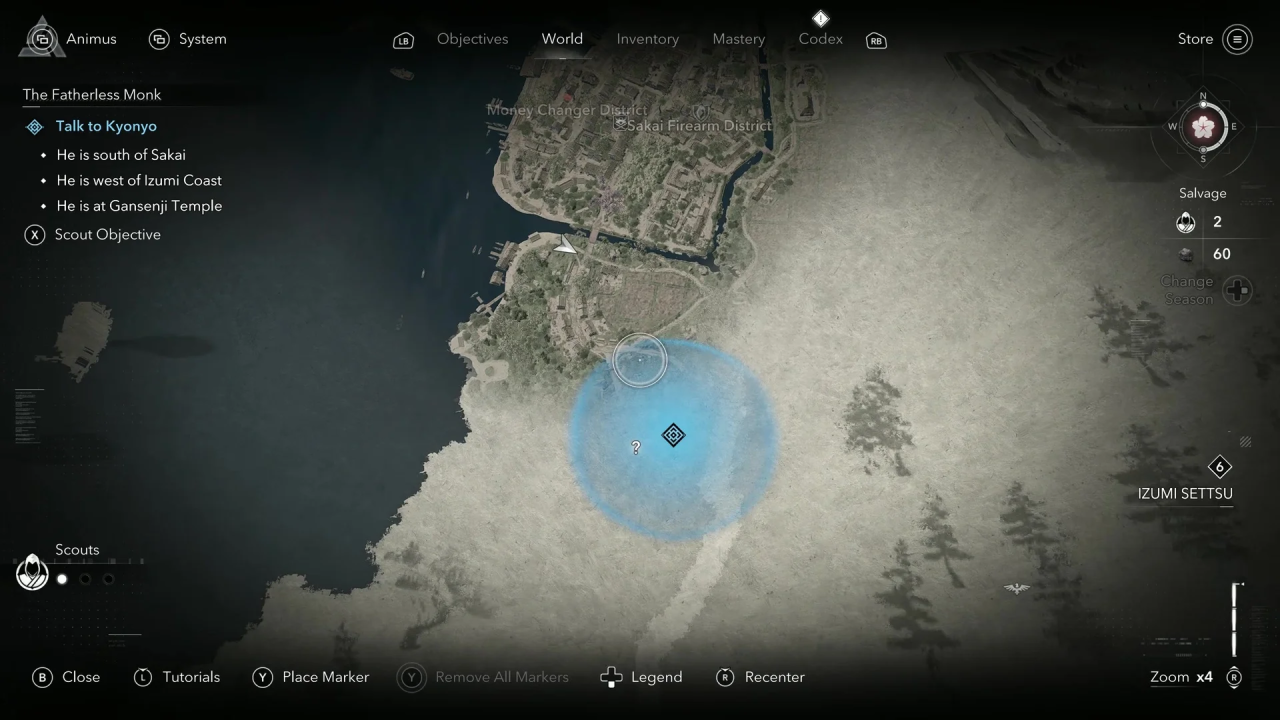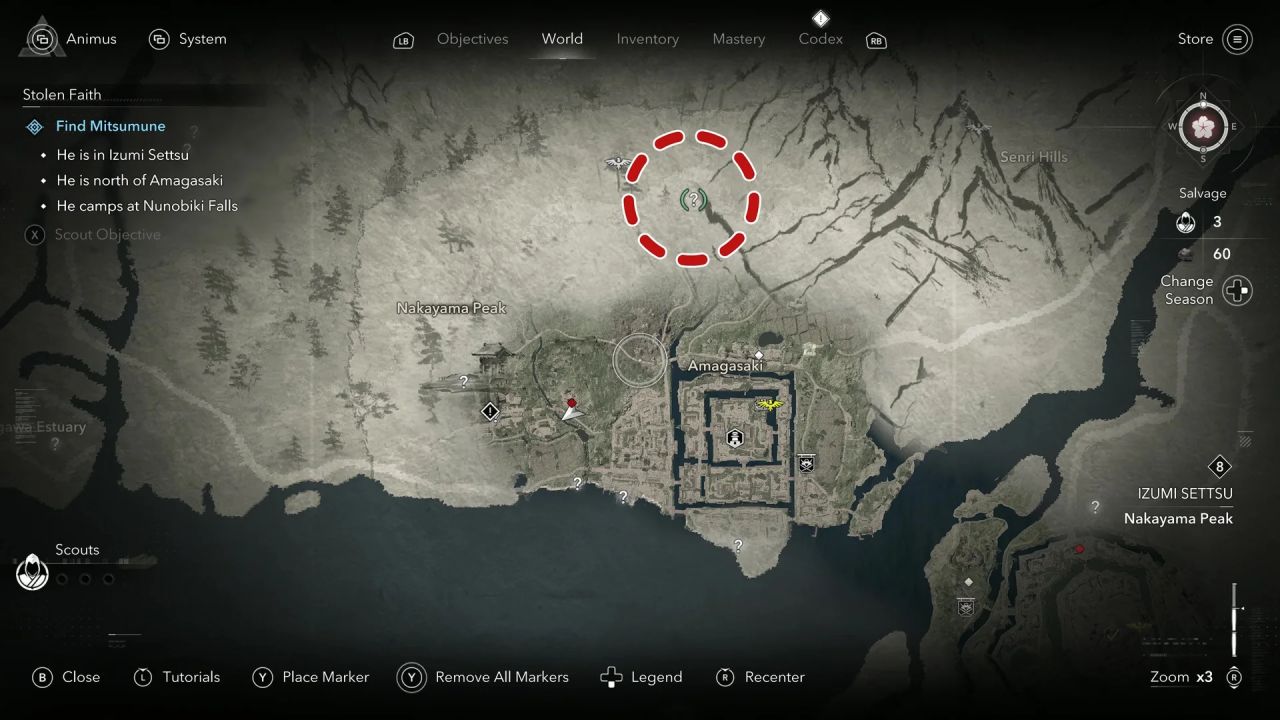 Если вы всё ещё находитесь в Сакаи, вам нужно будет отправиться на север, в город Амагасаки. Подсказки предлагают проверить местность к северу от города, чтобы найти водопад Нунобики, что означает, что он, скорее всего, находится в глуши около гор. Если вы использовали ближайшую точку синхронизации, заметите «вопросительный знак» к северу от Амагасаки. Значки «вопросительного знака» намекают на неоткрытое интересное место. Это идеальный вариант для начала поисков! Если у вас есть лазутчик, можете поручить ему обыскать территорию, чтобы точно определить цель. Но тратить разведчика не стоит.