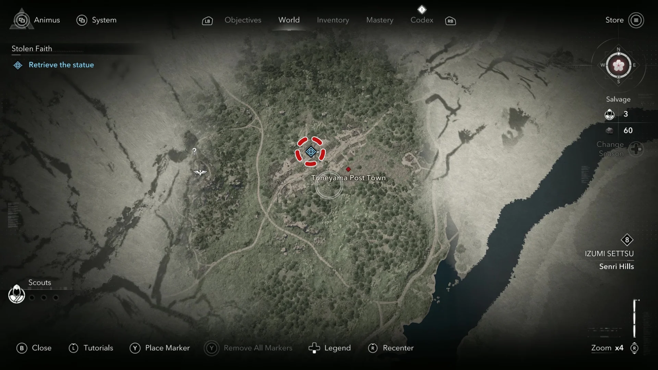 Чтобы добраться до нужного места, разумнее использовать кусты и крыши, а не главную улицу. Возле здания находится элитный противник в тяжёлой броне Элит. Если ваш уровень слишком низок и в настройках не включены гарантированные скрытные убийства, вы не сможете его убить мгновенно. Ищите статуэтку, расположенную между тайниками с добычей в углу здания. Прежде чем двигаться дальше, обязательно исследуйте лагерь на предмет добычи и ресурсов, которые вы можете использовать для улучшения своего Убежища. Теперь, когда у вас есть статуэтка, пришло время вернуться к Мицумунэ. Вы найдёте его в том месте, где он и был оставлен — у водопадов Нунобоки.