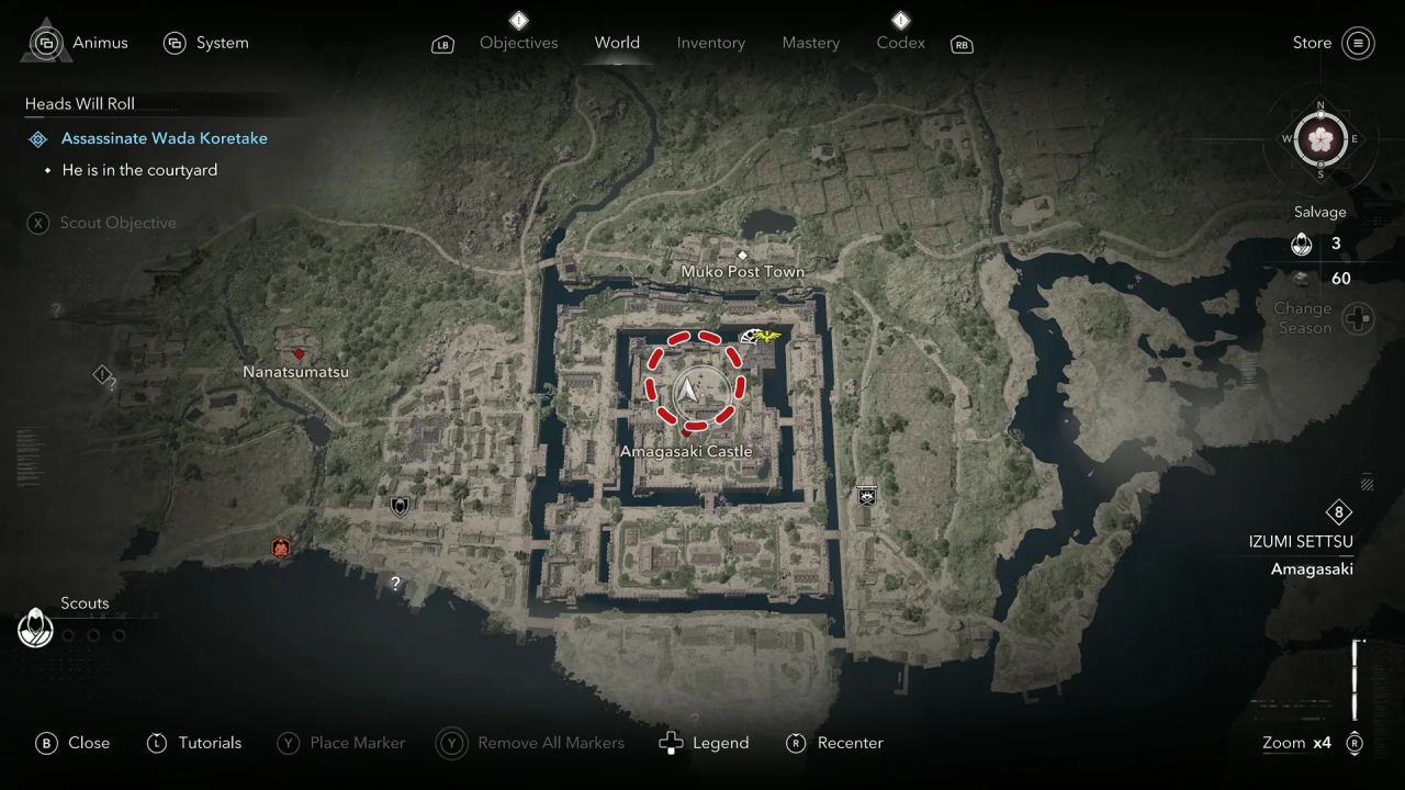 Кёнё, Яя и Наоэ вскоре присоединяются к Мицумунэ, который со своими людьми ждёт около главных ворот замка Амагасаки. После кат-сцены вы снова получите контроль над Наоэ. Игра «забросит» вас на стены замка, пополнив провизию и инструменты. Первая задача — устранить стрелков, стоящих на стенах. Все они отмечены целевыми маркерами над головой и также отображаются на компасе в верхней части вашего интерфейса. Найдите первого стрелка на западной стене.