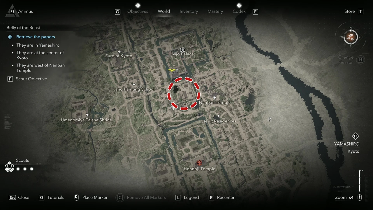 «Брюхо зверя» — задание, которое идёт следом за миссией «Друг моего врага», в которой Наоэ объединилась с Акэти Мицухидэ. Вы, наконец, покинете наскучившую провинцию Идзуми-Сэтцу и отправитесь в Ямасиро (регион 10-го уровня), расположенную на севере. Откройте карту, чтобы найти целевой маркер в центре провинции, где находится Киото — один из крупнейших городов AC Shadows.
