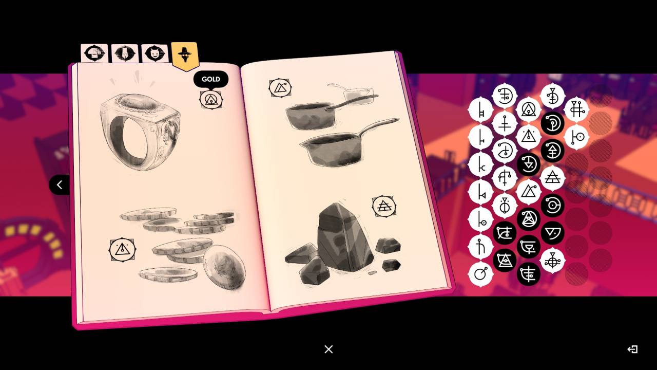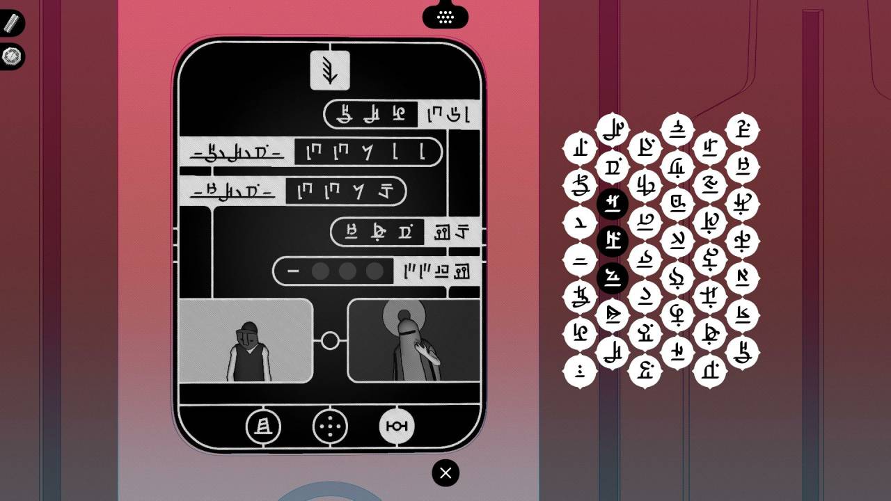 Без ответа остаётся и другой важный вопрос: кто этот невидимый всезнайка, которому с самого начала известны все значения всех глифов? Понятно, что игре нужны какие-то промежуточные отсечки прогресса — было бы очень обидно, если бы спустя часы геймплея оказалось, что все свои догадки я строил на ошибочном фундаменте, — но фан от игры и заключается в том, чтобы размышлять, строить предположения и подкреплять и опровергать их новыми данными, а Chants of Sennaar не только знает всё априори, но и держит игрока на коротком поводке, то и дело его поправляя и не давая ошибаться. Самый характерный пример: однажды глифы, которые я в заметках подписал как «кольцо», «монета», «сосуд» и «камень», после валидации превратились в «золото», «серебро», «медь» и «углерод» — это произошло ещё до того, как у меня в принципе появилась возможность осознать свою неправоту.