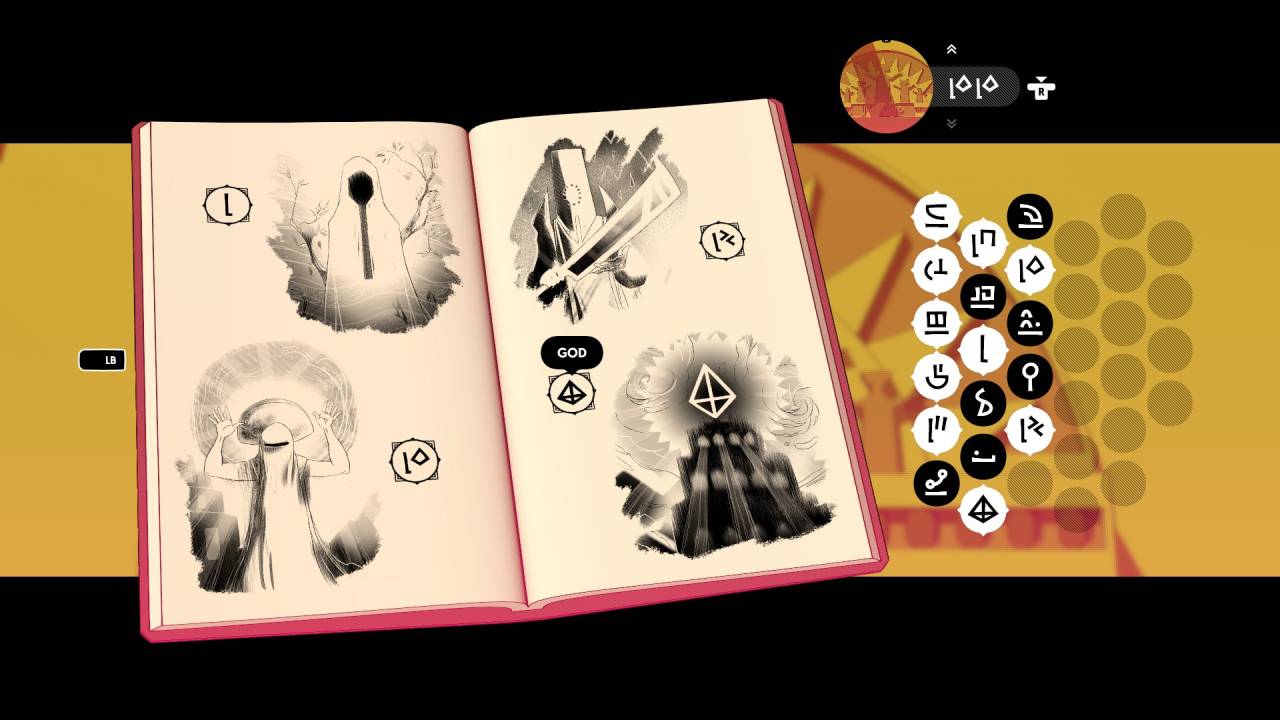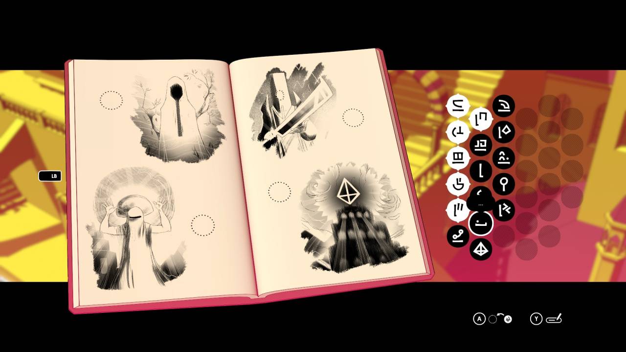 Самая слабая часть Chants of Sennaar, на мой взгляд, — это верификация гипотез. Чтобы изучить новый язык и пройти уровень, нужно много гулять по локациям, взаимодействовать с NPC, читать всё, что попадается на пути, и решать головоломки — и когда вы активируете последовательность невидимых триггеров, главный герой решит, что узнал достаточно, и начнёт рисовать у себя в блокноте. Рисует он обычно по три-четыре картинки за раз, и стоит сопоставить с каждым изображением соответствующий ему глиф, как игра покажет верный, «каноничный» перевод этих глифов и сохранит его в словаре — эта механика явно навеяна Return of the Obra Dinn, где предположения тоже подтверждались только группами.
