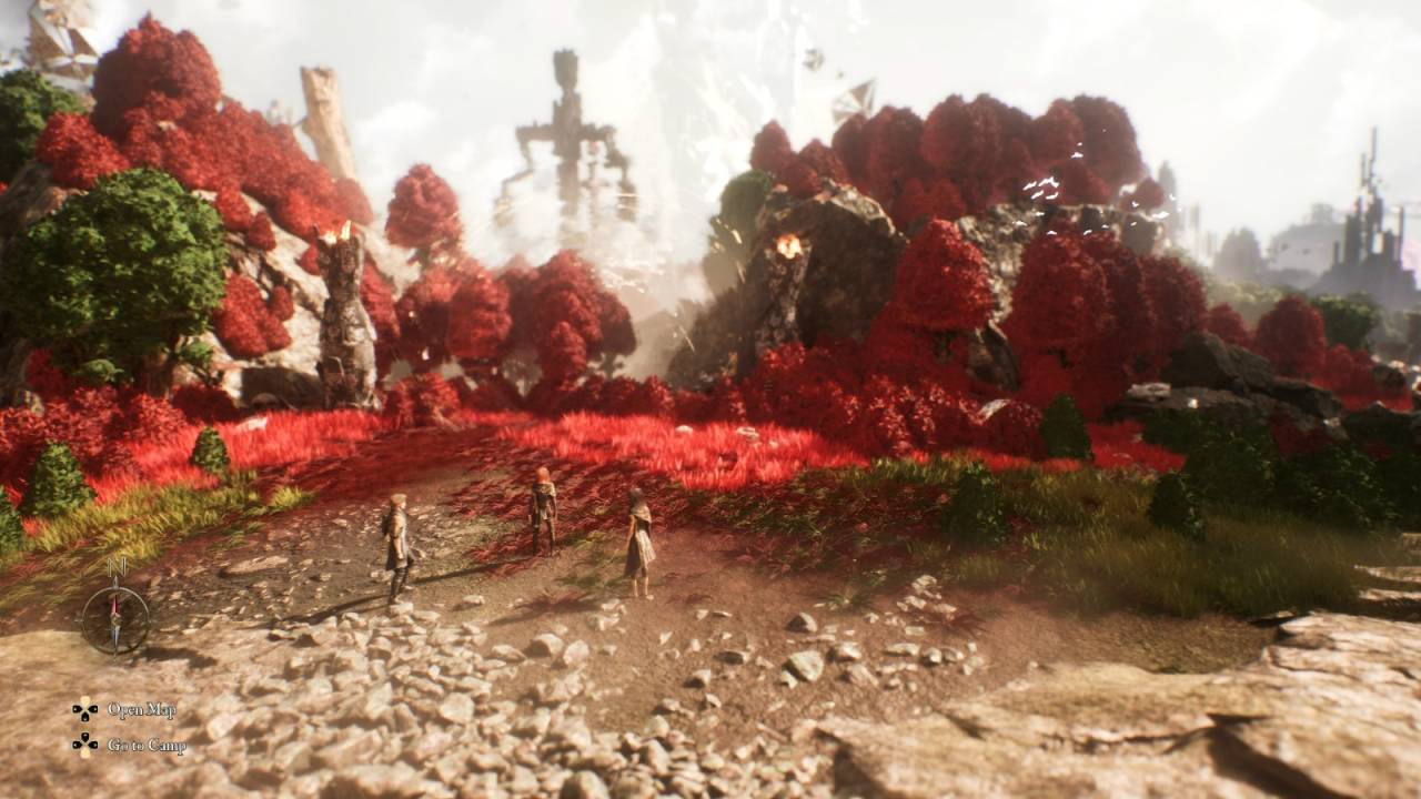 Теперь вы снова окажетесь на карте мира, в новой области за пределами Парящих вод. Зона здесь немного больше предыдущей и усеяна множеством вихрей. Цель вашего визита — большая роща из красных деревьев к северо-западу от стартовой локации. Перед тем как туда отправиться, сделаем небольшой круг по доступной части карты мира, чтобы отметить необязательные зоны и собрать несколько предметов.