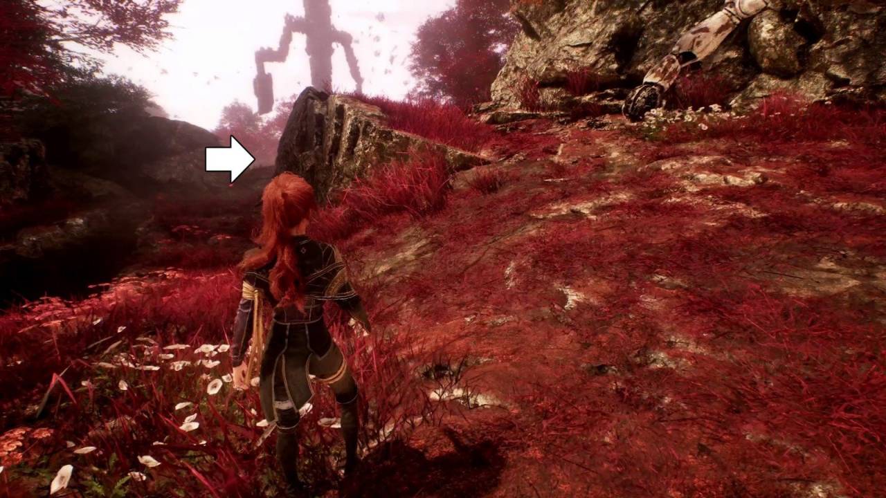 Стоя всё в той же локации, пройдите вперёд вдоль ручья (не поднимайтесь по склону справа). Следуйте по нижней тропе вдоль водоёма, сверните за угол и найдите стену, по которой можно спуститься на уступ ниже. Здесь лежит пиктос «Обжигающая метка» (ожог наносится при попадании по врагу, на котором есть метка). Вернитесь и теперь идите по основной тропе вдоль утёса, ведущей направо. Вскоре вы встретите безмолвного мальчика, с которым можно взаимодействовать. Пройдите мимо него на следующую поляну. Как только попадёте на неё, начнётся кат-сцена, за которой последует битва с Крепким бульбомехом.