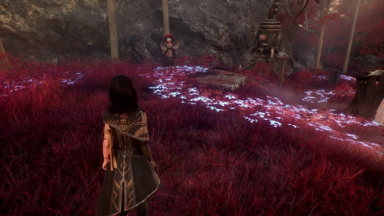 Чтобы добраться до самой красочницы, вернитесь туда, где сражались с предыдущим бульбомехом. Ищите проход между деревьями между двумя статуями слева. Пройдите через него, спуститесь по верёвке и прыгайте по уступам вверх, пока не доберётесь до красочницы. Внутри — осколок эликсира хромы.