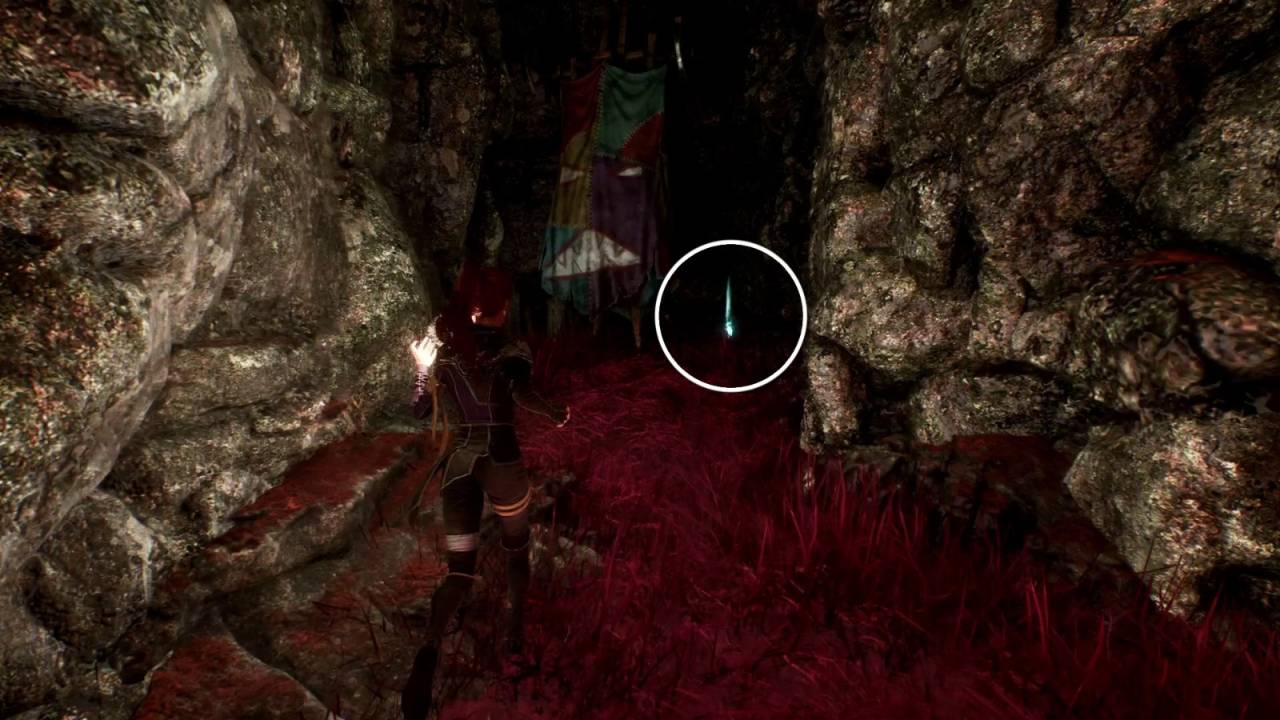 От флага «Лабиринт святилища» двигайтесь вперёд, пока не дойдёте до развилки. Сначала сверните в правую сторону. Обратите внимание на пещеру справа с проходом, через который можно проползти. Внутри можно свернуть налево или направо. Сначала исследуем левую сторону. Пройдя вперёд, вы окажетесь на открытом участке. Держитесь левой стороны, чтобы найти путь, ведущий к цвету люмины. В разрушенной хижине в центре локации находится осколок тоника воскрешения. За хижиной вы обнаружите Мима. Этот противник идентичен предыдущим, но с увеличенными показателями урона и выносливости. Победив его, вы получите причёску и наряд для Люнэ «Багет».