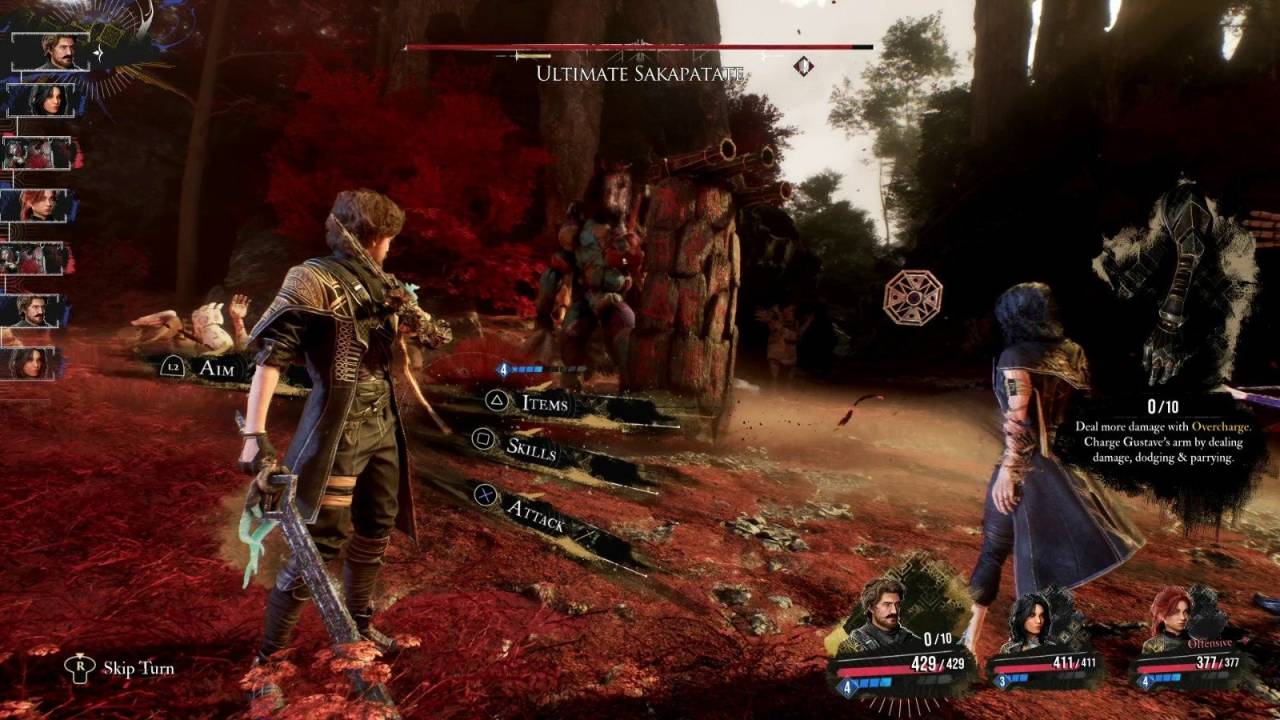 Это улучшенная версия бульбомехов, встреченных ранее. Он обладает схожими атаками, но имеет на щите три пушки, а также использует дубину и щит. Пушки наносят урон по всем трём героям и могут наложить эффект горения, если не уклониться или не парировать. Когда босс поднимает щит, и вы его атакуете — он наносит мощную контратаку по всей группе и в случае успеха оглушает ваших песронажей. В такие моменты лучше использовать баффы на себя. Босс уязвим к огню. Горение наносит урон с каждым ходом. Используйте для этого навыки Люнэ и атаки Маэль. Если удастся сломать босса (например, «Разрядом» Гюстава), он опустит щит, а вы увидите слабое место на левом плече. Стреляйте по этому месту, чтобы уничтожить руку. Босс больше не сможет использовать атаки щитом и стрелять из орудий.