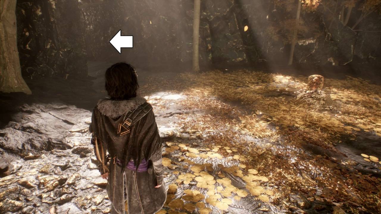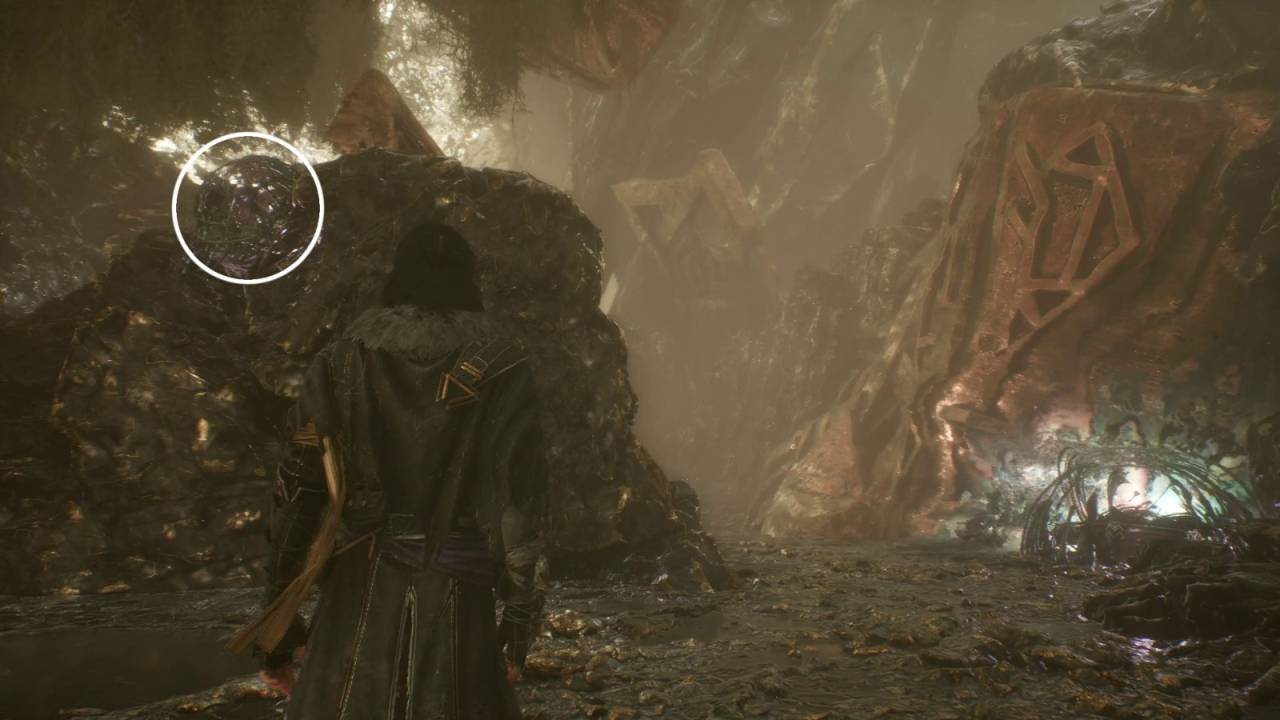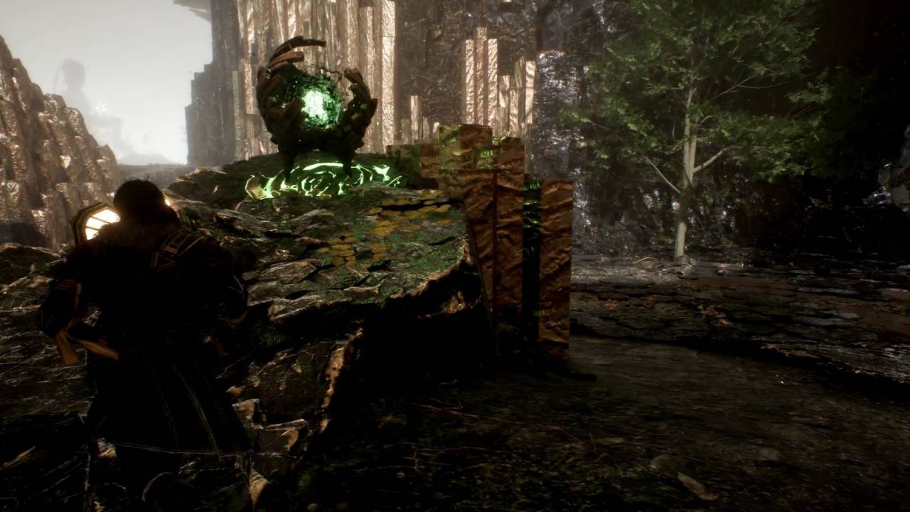 Спуститесь и продолжите движение по основному пути, уничтожив преграждающих дорогу врагов (свет, трубадур и шалье). Справа от места, где стояли противники, за повозкой лежит ещё одна порция хромы — 2130 единиц. Слева от выхода с поля боя — цвет люмины. Продолжите движение, пока не дойдёте до травянистой площадки с надгробием посередине. Отсюда отходят две тропы — влево и вправо. Правая ведёт вглубь территории, а вот левая — к двери поместья. Давайте туда заглянем!