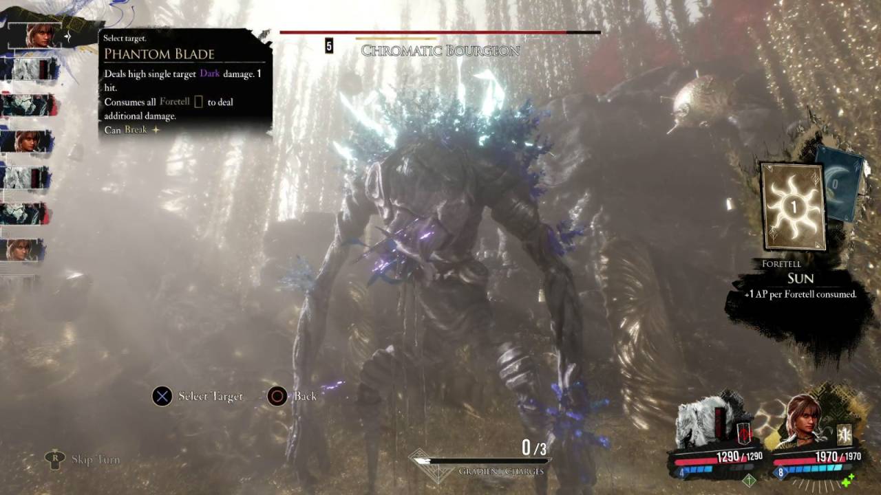 Это усиленная версия уже знакомых вам бутонье. Хроматическая вариация противника имеет огромный запас очков здоровья и мощные атаки, аналогичные обычным версиям, но с повышенной силой. Особенность боя: босс способен поглотить одного из членов отряда. Персонаж будет выведен из строя до тех пор, пока вы не нанесёте достаточный урон или не сломите противника, заставив его выплюнуть союзника. Если повезёт меньше, он может съесть даже двух героев к ряду, и вы будете вынуждены сражаться один на один. Способность «миазмы» выпускает четыре сгустка смертоносной жижи, наносящей урон и накладывающей эффект истощения, из-за которого персонаж не накапливает ОД (очки действия) в течение пары ходов. Есть пиктос, который усиливает персонажей под истощением. Слабость босса — урон молнией. Используйте способности Люнэ, а также любое оружие с этим элементом.