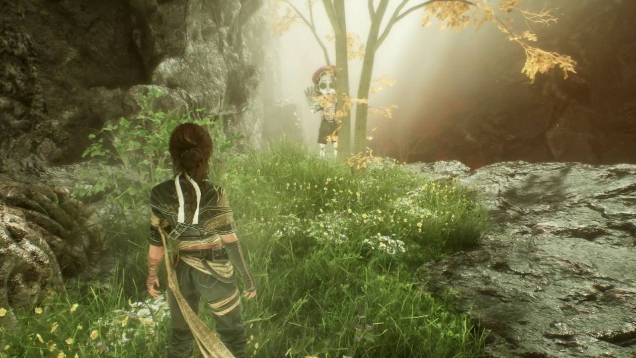 Мальчик, как становится ясно, говорил об Источительнице — той самой, с которой вы уже сталкивались. Вернитесь к флагу «Смолистая роща», спуститесь по верёвке, расположенной слева, опуститесь ещё ниже и снова зайдите в пещеру. Поговорите с Источительницей — на этот раз диалог будет доступен. После этого направляйтесь обратно к мальчику — он откроет вам дверь, ведущую дальше.