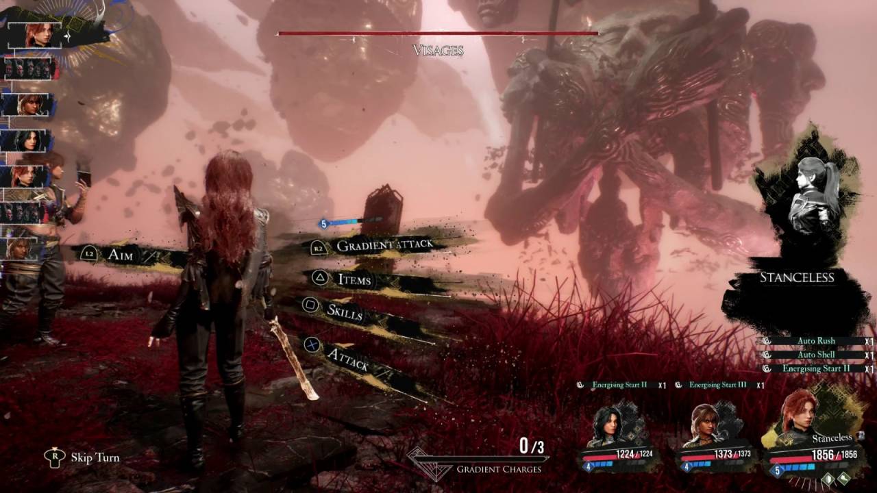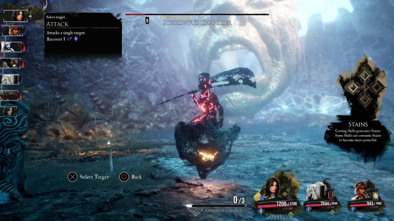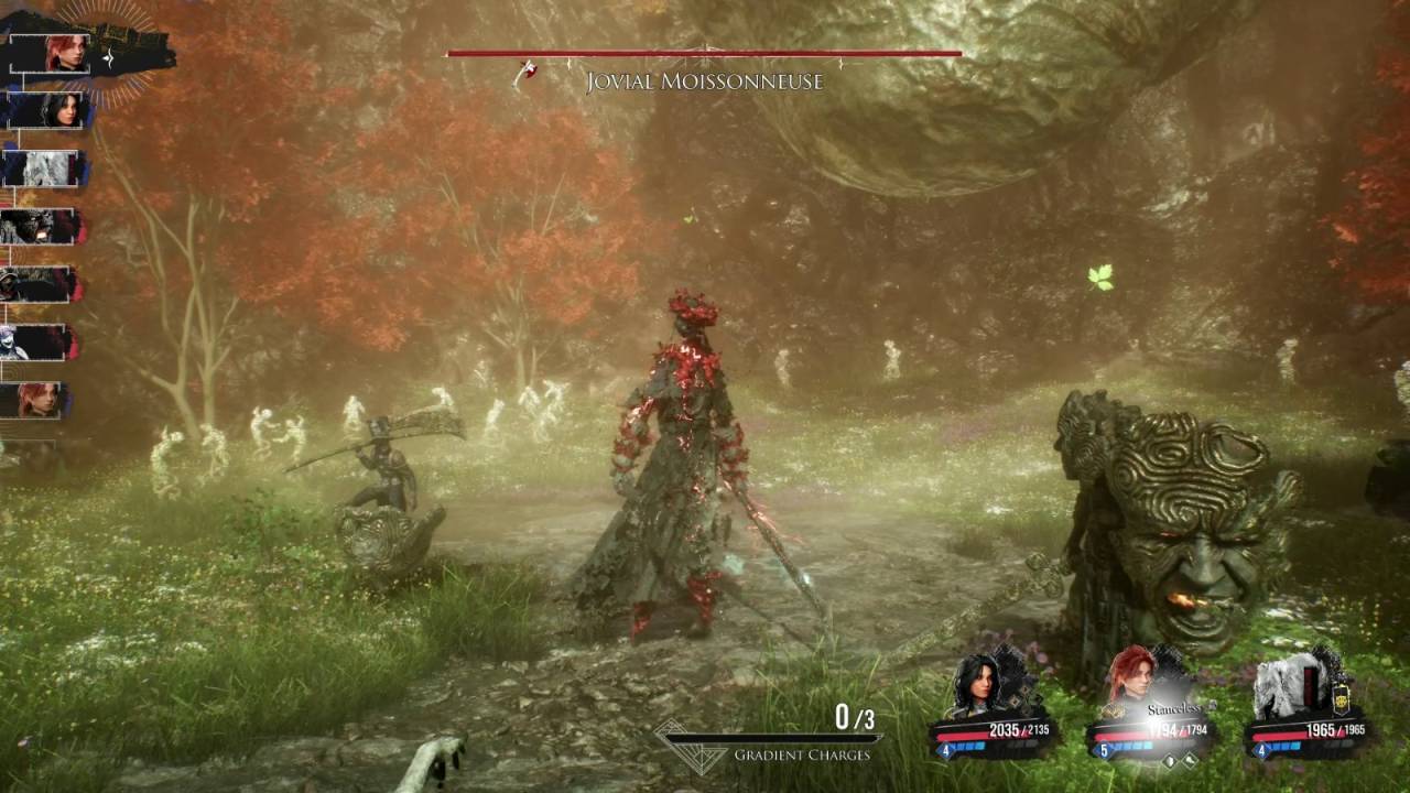 Другой уникальной особенностью этого боя является то, что гигантская маска на заднем плане может влиять на бой. Периодически она будет целиться в одного из ваших персонажей и накладывать на него дебафф истощения, который не позволит накапливать ОД, что может быть раздражающим, но не чем-то непреодолимым.