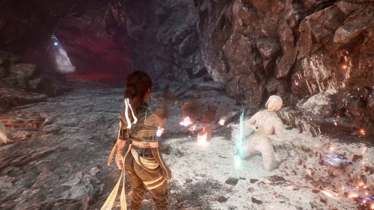 Продолжите движение по пути и вскоре найдёте магическую верёвку. Используйте её, чтобы спуститься в нижнюю область. Здесь есть акробат, которого нужно победить, охраняющий пиктос «Усиленная атака» (каждый раз при нанесении урона можно попробовать поглотить 1 ОД; в случае успеха, урон возрастает на 20%). Следуйте по пути из тупика, и окажетесь прямо перед гигантской маской. Прежде чем подойти к ней, посмотрите на противоположную сторону основного пути, чтобы найти вход в пещеру. Прежде чем войти в пещеру, поднимитесь по склону слева. Победите врагов и заберите сверкающий катализатор хромы. Войдите в пещеру, и вскоре заметите, что она делится на две части. Слева есть вражеская группа, охраняющая пиктос «Двойной ожог» (второй ожог каждый раз при наложении суммирующегося ожога). Справа будет дверь, ведущая в особняк… давайте сделаем небольшой крюк и проверим его.