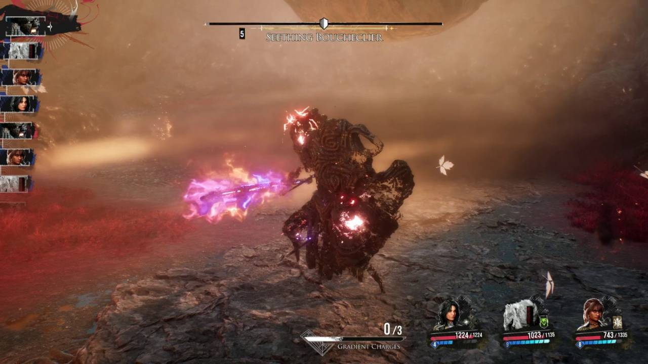 Хорошая новость заключается в том, что все трое врагов (включая босса) слабы к огненному урону. Кроме того, огненные атаки могут поджигать щиторота, нанося дополнительный урон со временем (каждый раз, когда наступает его ход). Это делает Люнэ и Маэль лучшим выбором для этой битвы благодаря их огненным атакам. Сам босс также уязвим к тёмному урону, поэтому будет полезна и Сиэль.