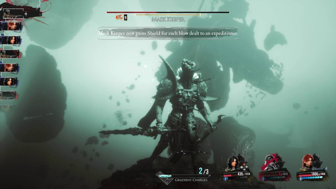Хорошие новости: как и предыдущий босс (Многоликий), Хранитель масок устойчив к льду, но уязвим к огненному и тёмному урону. Учитывая, что вы не можете сменить группу перед вторым боем, это полезно. Огонь традиционно хорош: он не только наносит увеличенный урон, но и может наложить стаки ожога, наносящего дополнительный урон в начале каждого хода противника. Особенно эффективны в этом плане «Испепеление» Люнэ и атаки Маэль — обязательно возьмите их в команду! Также эффективен тёмный урон, так что Сиэль или любой персонаж с оружием, нацеленным на эту стихию, будет хорошим выбором.