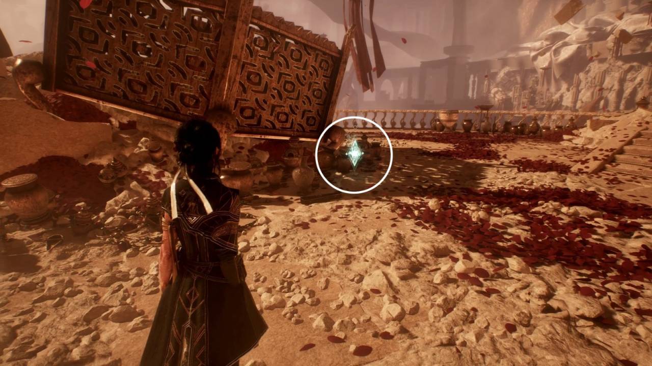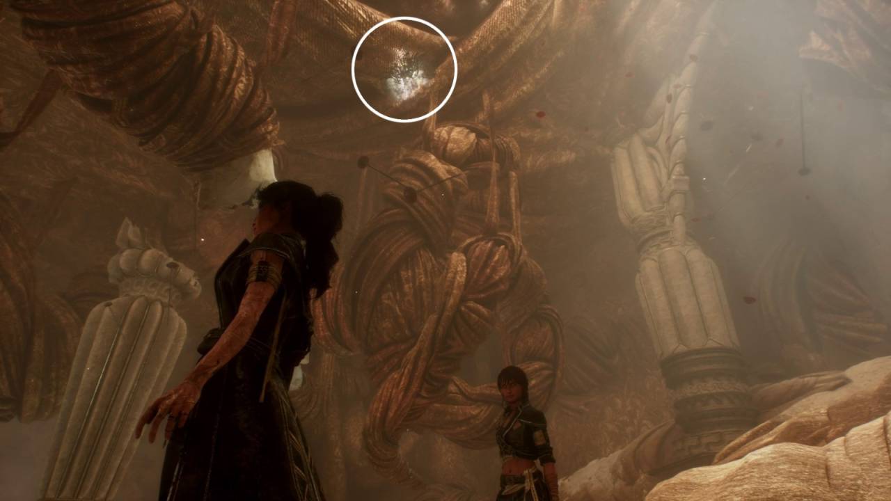 От флага, стоя лицом к Глиссандо, обратите внимание на проходы слева и справа. Сперва идите направо, возьмите осколок тоника энергии и следуйте дальше. Используйте волшебную верёвку, чтобы попасть в нижнюю зону. Перепрыгнув через первую пропасть и проползите через узкий проход, чтобы найти пиктос «Целительный огонь» (атака на цель с ожогами восстанавливает 25% здоровья, один раз за ход). Перепрыгните обратно через яму — вы окажетесь на левой стороне комнаты с боссом (его можно разглядеть сквозь колонны). Осмотритесь у основания колонн и найдите 1763 единицы хромы.