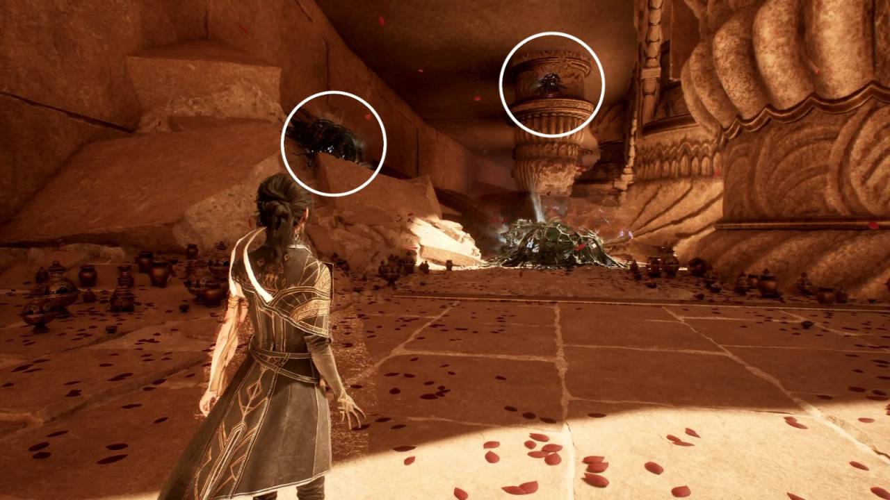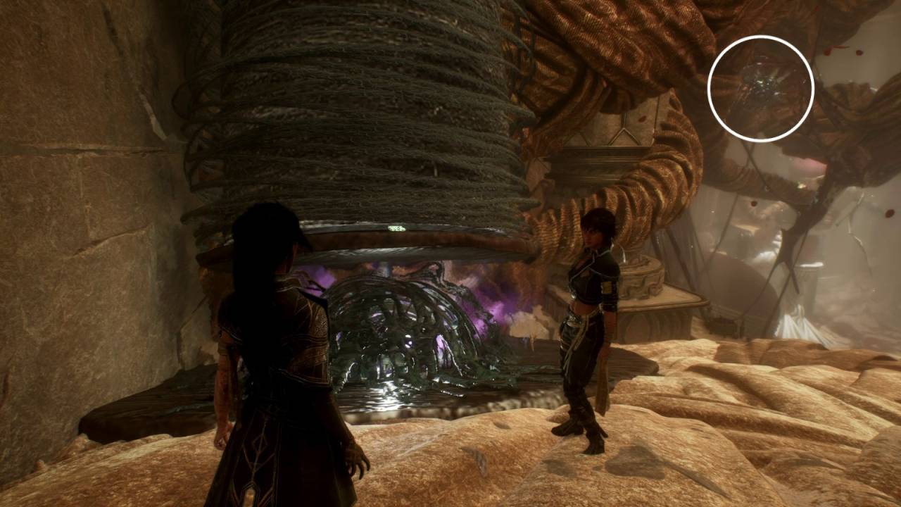 Противоположно основанию волшебной верёвки — точка захвата. Используйте её, затем спуститесь по лестнице. Оказавшись снаружи, слева найдите слева красочницу. Её три замка находятся неподалёку: один — на куче обломков, другой — у основания каменной колонны, третий — за завалом у двери, откуда вы пришли. Сломав все три замка, откройте красочницу и получите пиктос «Узы щитов» (при наличии щитов наносимый урон возрастает на 30%, при получении любого урона все щиты снимаются). Используйте подъёмную платформу, чтобы подняться выше. С ближайшей платформы можно пойти налево или направо. Путь влево ведёт к опциональному боссу хрома-культистке с мечом.