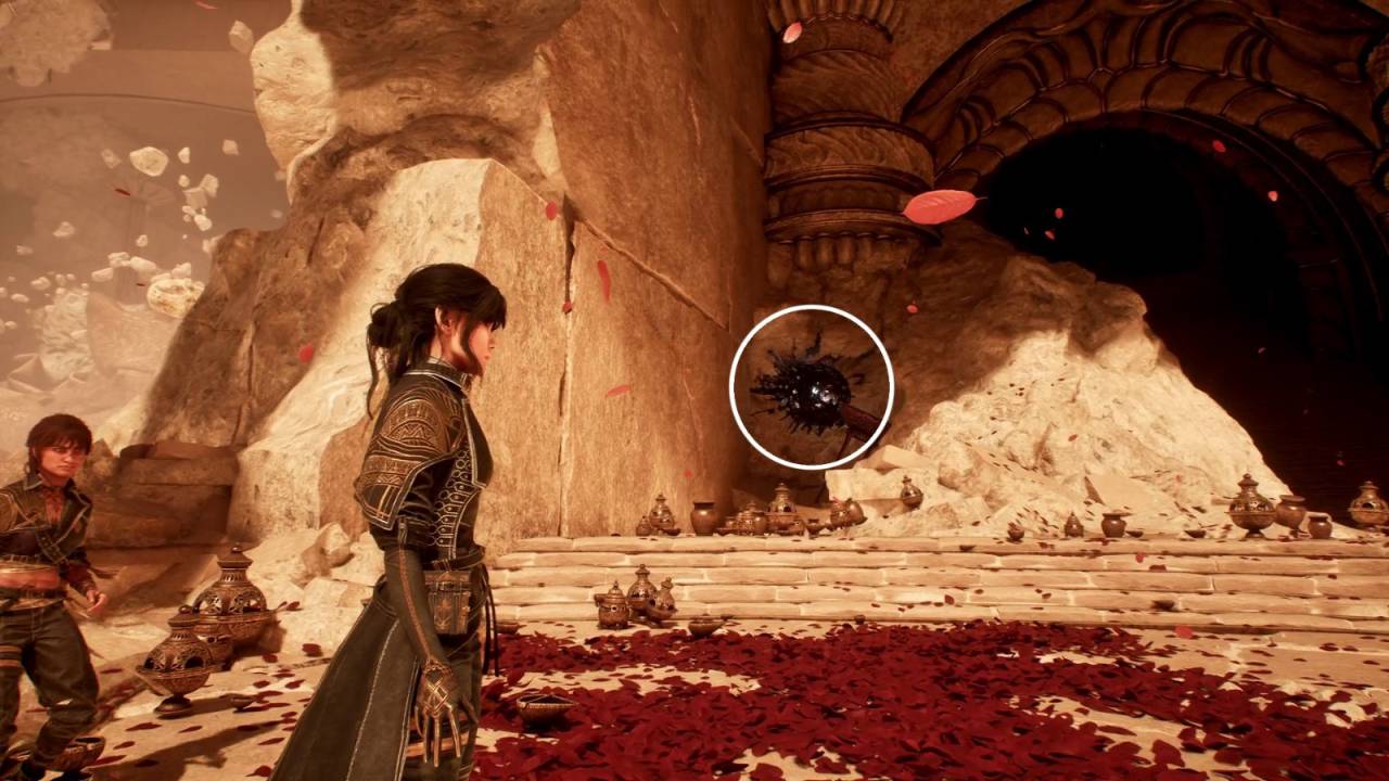 После выхода с платформы ищите поблизости жестраля, с которым можно поговорить. Далее — большой зал со статуей в центре и тремя выходами: вперёд, направо и налево. Справа — основной путь. Проход влево ведёт к платформе петанка, а впереди —сам петанк и чаша с 3525 единицами хромы. Преследуйте Петанка, загоните в основной зал и в помещение слева (при движении из этой области будет справа). Победите петанка, чтобы получить 5 сверкающих катализаторов хромы, 5 цветов люмины и ретушь. Также разбейте красочный шип.