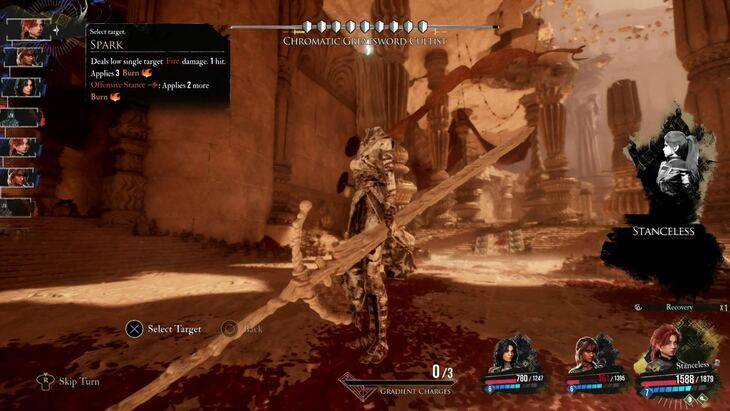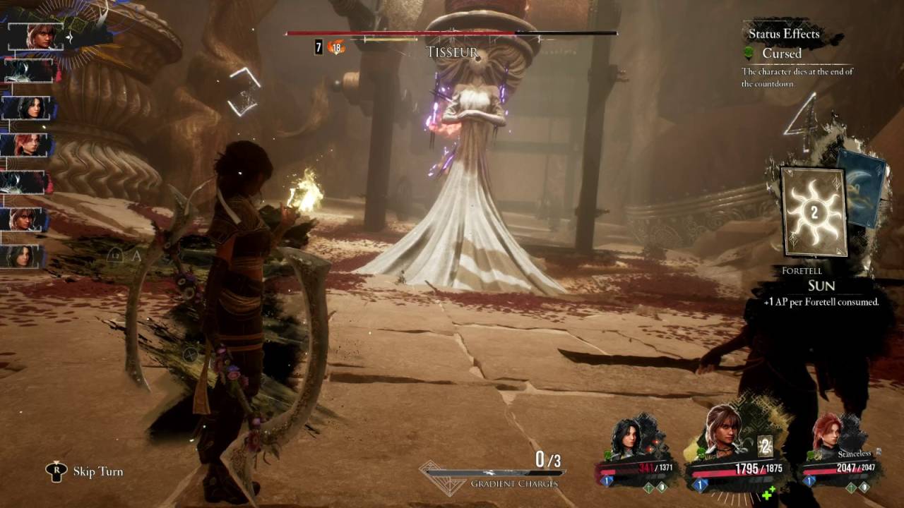 Если не справляетесь с уроном, можно наложить на союзника эффект «Рывок», ускоряющий его ход. Это может привести к более ранней смерти от проклятия, но после вы сможете его воскресить. Если распределить ходы персонажей по времени, у вас будет шанс воскресить их по очереди. Если же они будут действовать подряд, то могут погибнуть один за другим — и тогда вас ждёт «экран» Game Over.