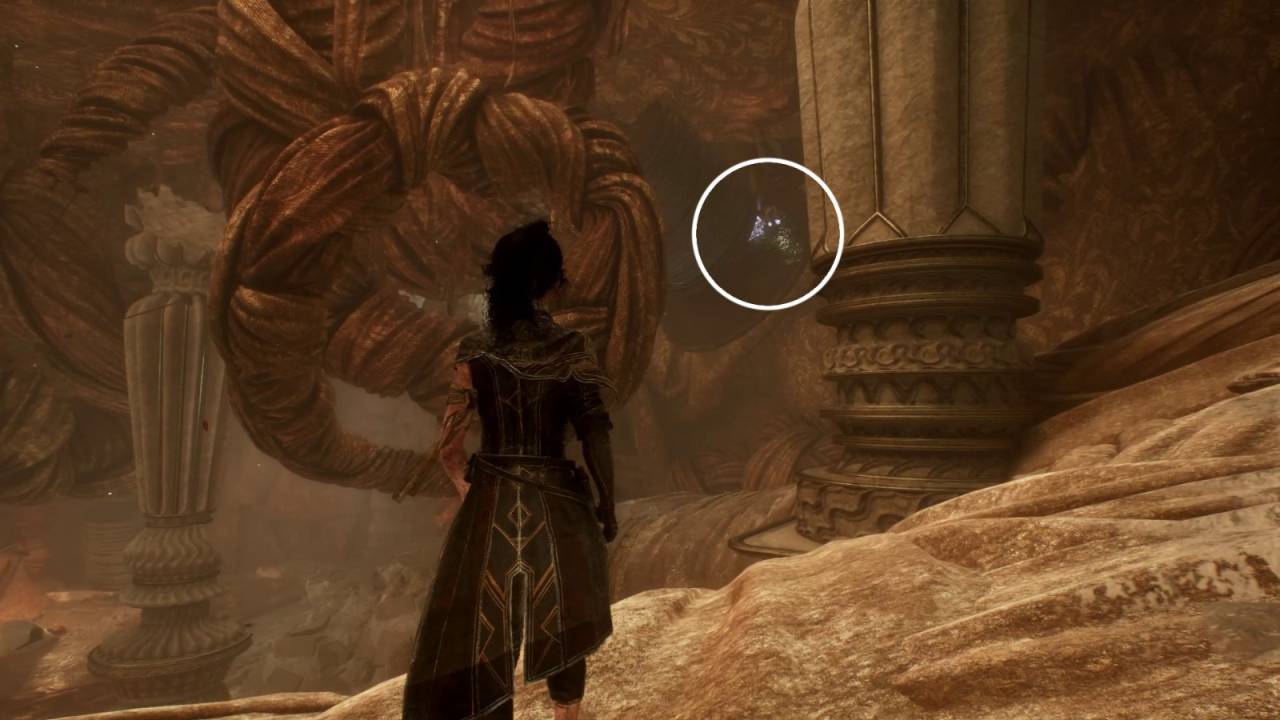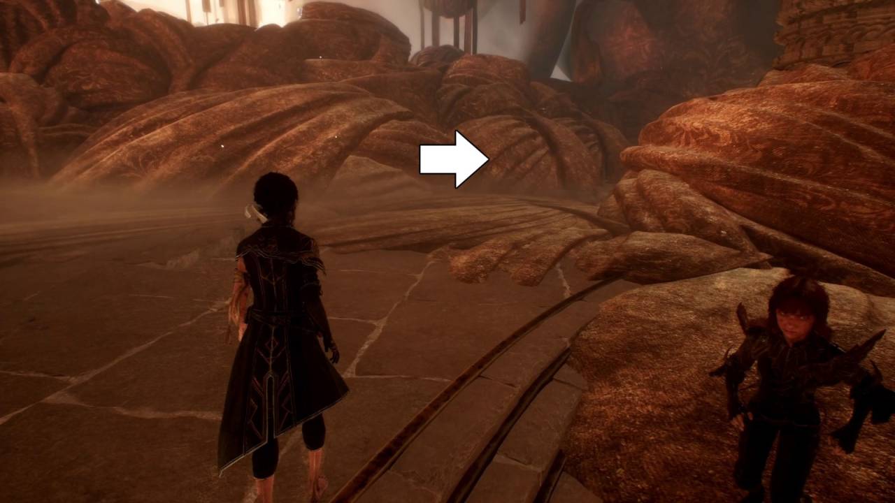 Двигайтесь направо от лифта через каменные колонны. По пути встретите три группы фуэте, у основания упавшей колонны — цвет люмины, далее — пиктос «Сверх-броня» (броня поглощает на 10% больше урона). Заберитесь по уступам, пройдите в тесный проход — найдёте катализатор хромы и точку взаимодействия, создающую волшебную верёвку. Спустившись по ней, окажетесь у первого лифта. Вернитесь к развилке у двери, на этот раз идите по основному пути вперёд. Победите ещё одну группу фуэте, на выступе в центре прохода подберите катализатор. В конце дорожки используйте летающую платформу, чтобы попасть в следующий район.