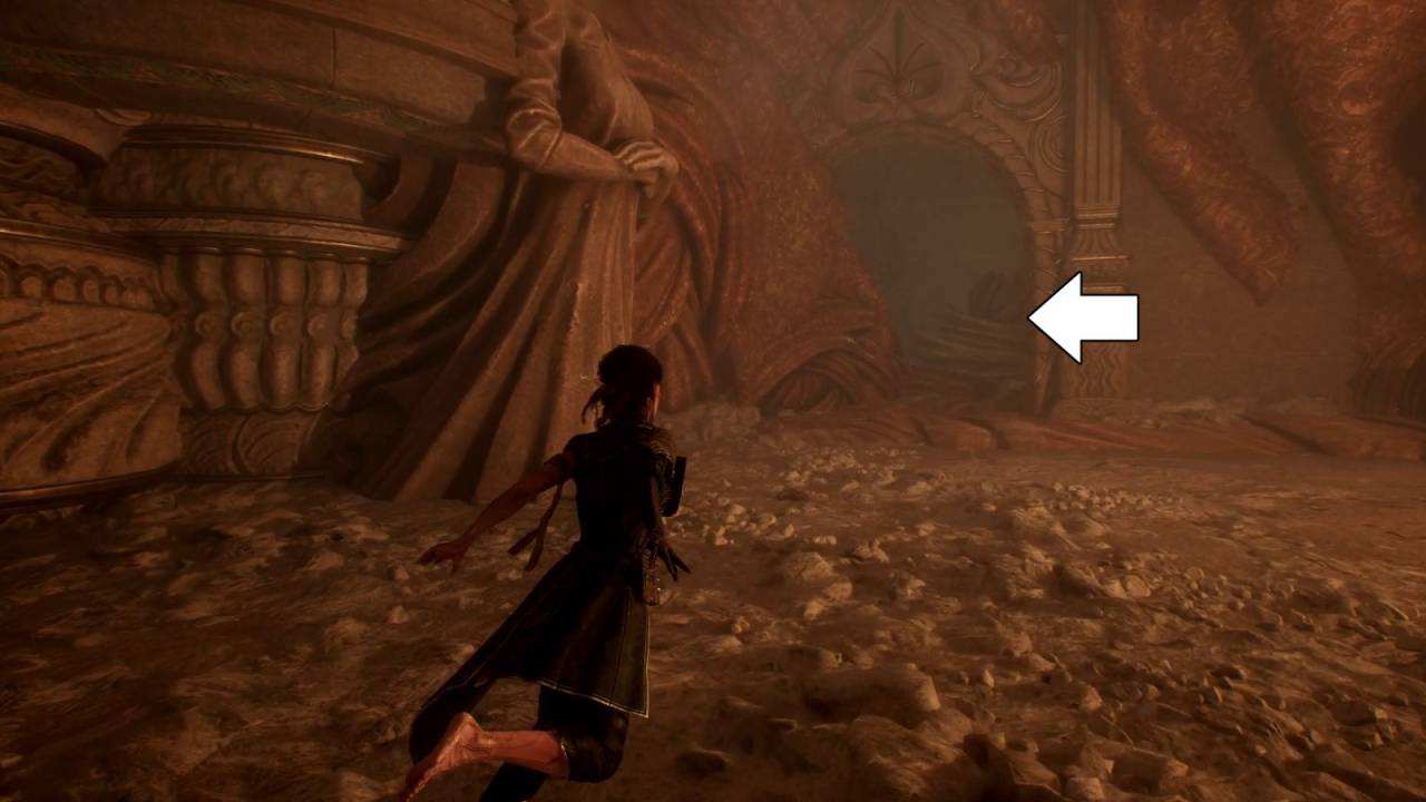 Вернитесь и используйте крюк. Перед тем как схватиться за вторую точку, снова сверните в сторону и дойдите до конца, чтобы найти ещё один цвет люмины. После второго крюка увидите с правой стороны дверь. Игнорируйте её и сверните по наклонной тропе слева. Победите двух благословов. В конце этой тропы находится сверкающий катализатор хромы. Можно спрыгнуть с уступа (если бы вы вошли в проигнорированную ранее дверь, то оказались бы здесь). Справа от статуи найдите частично скрытый проём. Следуйте туда, чтобы обнаружить спрятавшегося мима. Победите его, чтобы получить причёску Люнэ «Сирена». Пройдите по тропе от статуи и загляните в первую арку слева — там вы найдёте флаг экспедиции «Швейная мастерская».