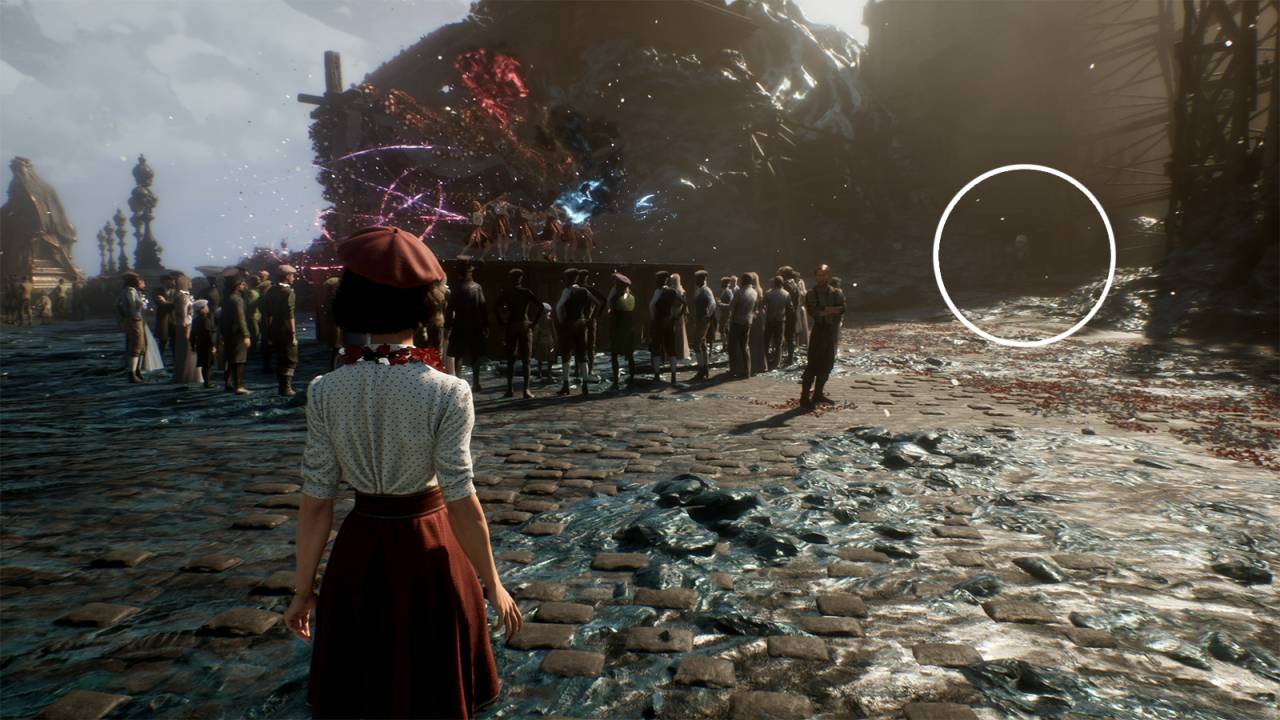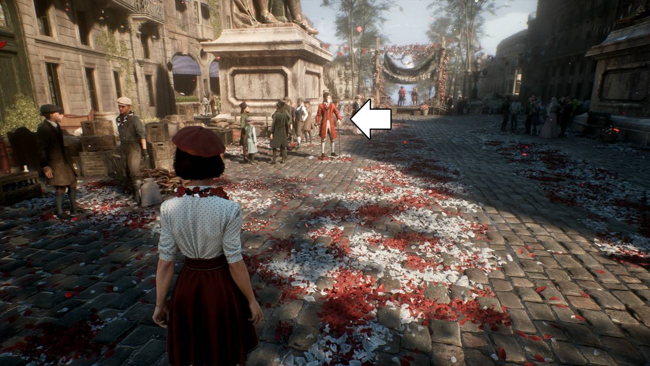 В начале игры мы будет управлять Гюставом. После короткого разговора с Маэль она предложит вместе отправиться в нижний город. Следуйте за ней. Перед тем как уйти, возьмите розу с ближайшей скамейки (нажмите на «квадрат» для взаимодействия или на клавишу E). Следуйте за Маэль, и она приведёт вас к точке, к которой можно притянуться крюком. Наведите на неё прицел и нажмите на «квадрат» или клавишу E, чтобы перебраться через пропасть. Продолжите путь, используя ещё две точки для крюка, после чего Маэль остановится и вызовет вас на дуэль. Здесь вы сможете пройти обучение (настоятельно рекомендуется, если играете впервые).