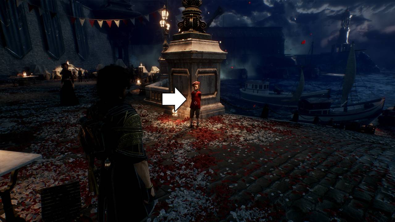 После кат-сцены вы снова получите контроль над Гюставом — теперь уже ночью, на Фестивале Экспедиции. Вы получите один праздничный жетон. Спуститесь по лестнице. Здесь есть несколько интересных мест. Поговорите с Жюлем — мальчиком в красном пальто у спуска к пирсу — и отдайте униформу, полученную от Ришара. Он настаивает, чтобы вы оставили её себе, и вы получите наряд для Гюстава «Багряная униформа». Также на противоположной стороне стоят ученики Гюстава — поговорите с ними, чтобы получить журнал.