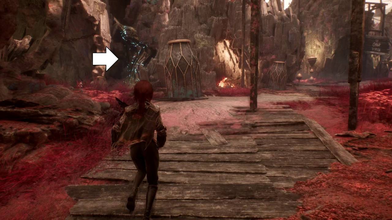 Вернувшись в основную зону, осмотритесь область рядом с точкой входа — внизу валяются 2495 единиц хромы. Спуститесь по выступам, чтобы её подобрать, затем вернитесь наверх. Вдалеке можно заметить опционального босса — огромную Хрома-танцовщицу, но добраться до неё можно будет только по завершении сюжетной линии Старого Люмьера!