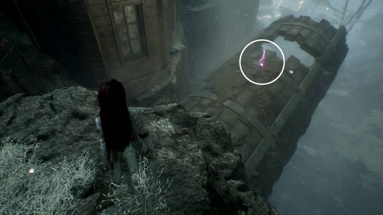 Пройдите через разрушенный дверной проём в открытую область и уничтожьте блуждающих фарфоровых шевальерок. Справа от входа в зону — большая бетонная труба. Спрыгните к ней — внутри найдёте цвет люмины. Спуститесь через отверстие в трубе к запертой решётке. Помните старый ключ, полученный во время фестиваля в честь Гоммажа в прологе игры? С его помощью можно открыть ворота. Внутри лежит журнал «Уцелевшая». В конце трубы используйте магическую рябь, чтобы создать верёвку и вернуться назад.