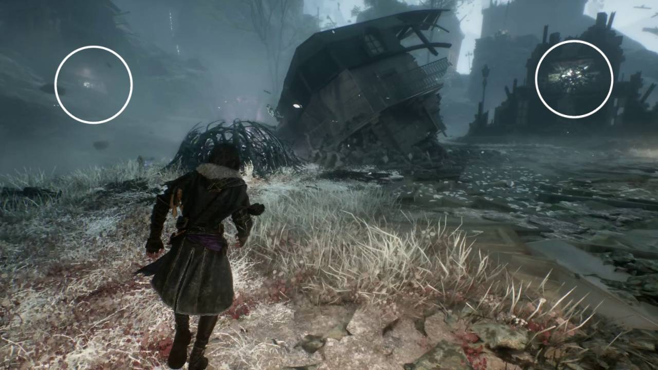 После победы над хрома-танцовщицей осмотрите область за корнями в дальнем конце платформы, чтобы найти 1248 единиц хромы. Также можно найти участок сломанных рельс, которые перекручены и уходят вверх, в сторону того места, где патрулирует хрома-танцовщица Дансеус. С верхушки этого участка рельс можно прыгнуть на ближайшую сломанную колонну и забрать 4990 единиц хромы. Добравшись до ближайшего флага Экспедиции, используйте его для перемещения к флагу «Правая улица».