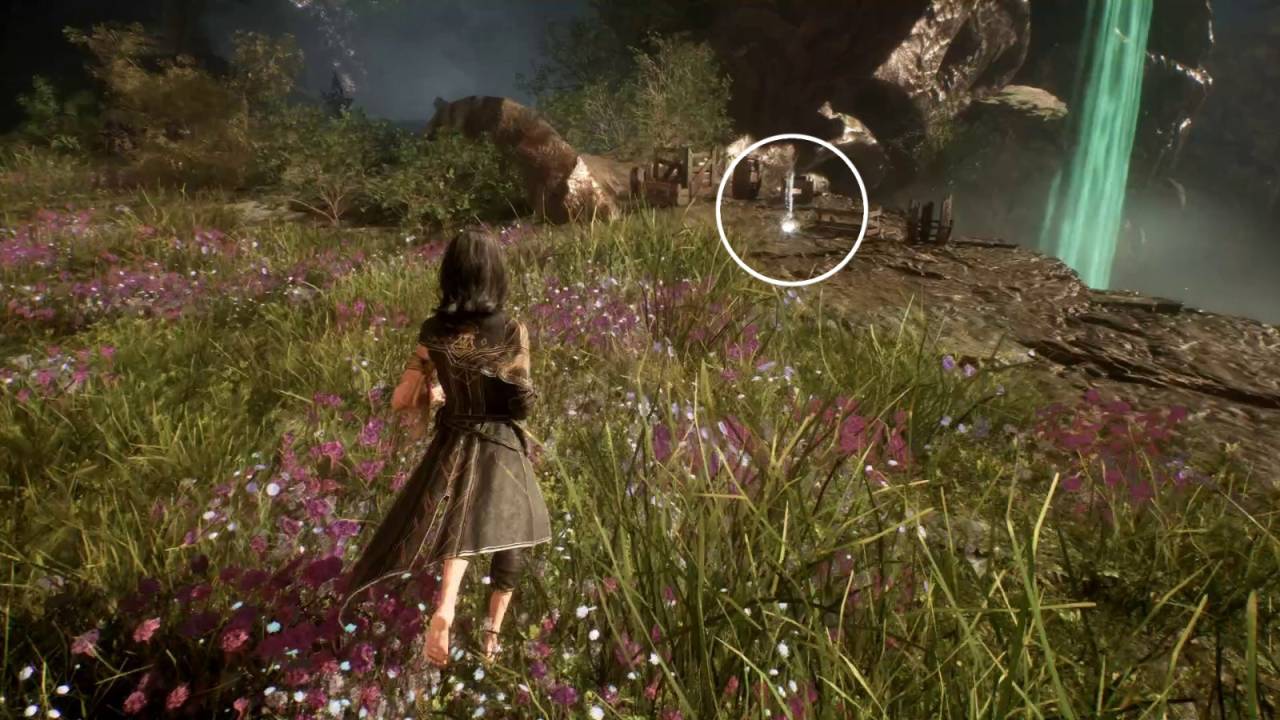 Вернувшись на основную тропу, вы увидите дом. Прежде чем подойти, осмотрите склон слева от дома и поднимитесь — там ещё 180 хромы. Подойдите к дому, победите несколько ланселье. Внутри, справа в углу, лежит катализатор хромы. Такие предметы, как писалось раньше, пригодятся для повышения уровня оружия.