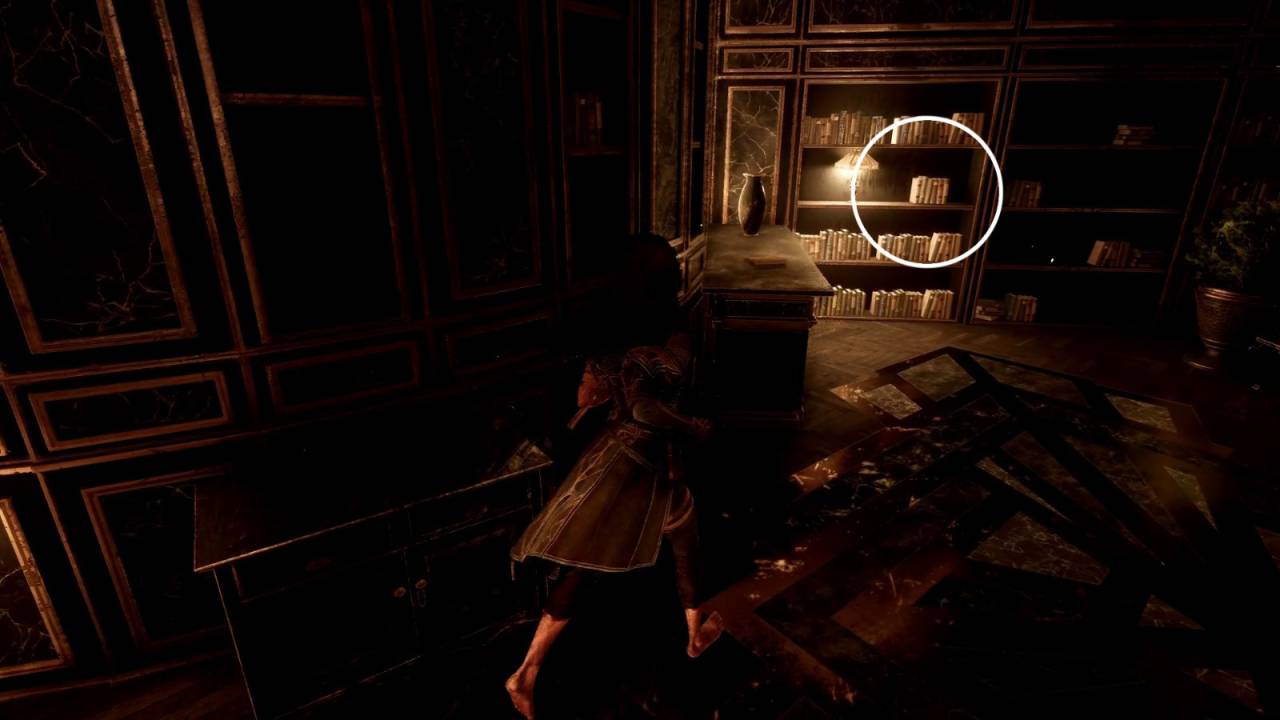 Вы окажетесь в библиотеке. Откройте дверь рядом — она ведёт к выходу. Дверь за вашей спиной ведёт в кладовую, которую мы находили ранее, двигаясь с кухни, куда попали через Селение жестралей. В самой библиотеке есть полезные вещи. Поднимитесь по винтовой лестнице на верхний этаж. Пройдите вперёд к полке с лампой и взаимодействуйте с книгами — откроется секретная дверь. На столе внутри — городской наряд для Версо. Пройдите дальше вдоль стены и взберитесь на выступ. Прыгайте по выступам, торчащим из стены — в конце лежит форма энергии. Спрыгните, вернитесь к выходу и выйдите через главную дверь, чтобы вернуться на остров.