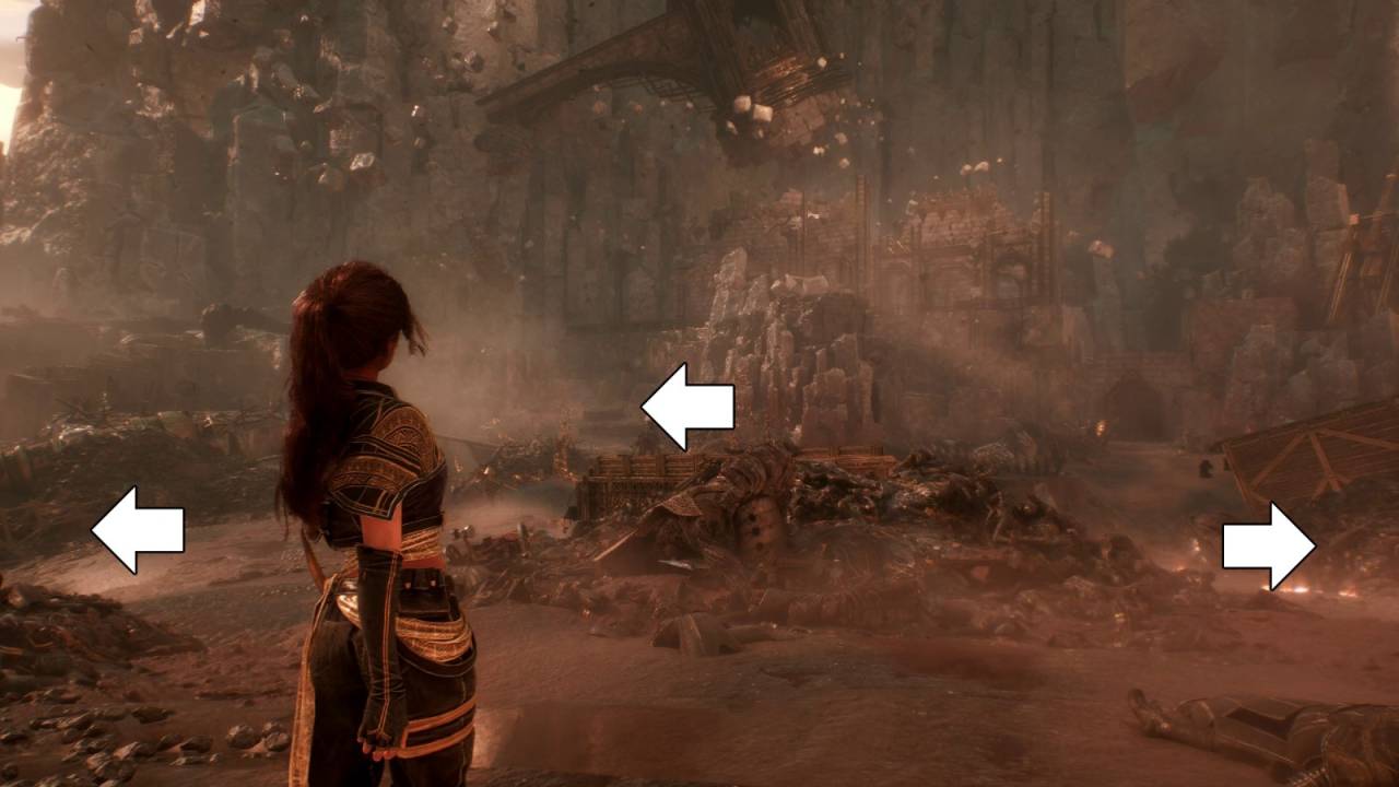 Теперь идите по правому пути. Пройдите через завалы и столкнётесь с шалье, трубадуром и собирателем. За победу над ними вы получите оружие Люнэ «Трубадим» 8-го уровня. Затем подберите лежащие рядом 988 единиц хромы. Спрыгните в канаву и следуйте по ней, пока не сможете подняться по склону справа. Там вы найдёте запертые ворота. Победите трубадура перед ними и осмотрите стену справа от ворот — там лежат 3950 единиц хромы. Вернитесь обратно в канаву и следуйте по ней вправо, пока не найдёте в тупике пиктос «Бодрящий старт IV» (добавляет 1 ОД в начале боя).