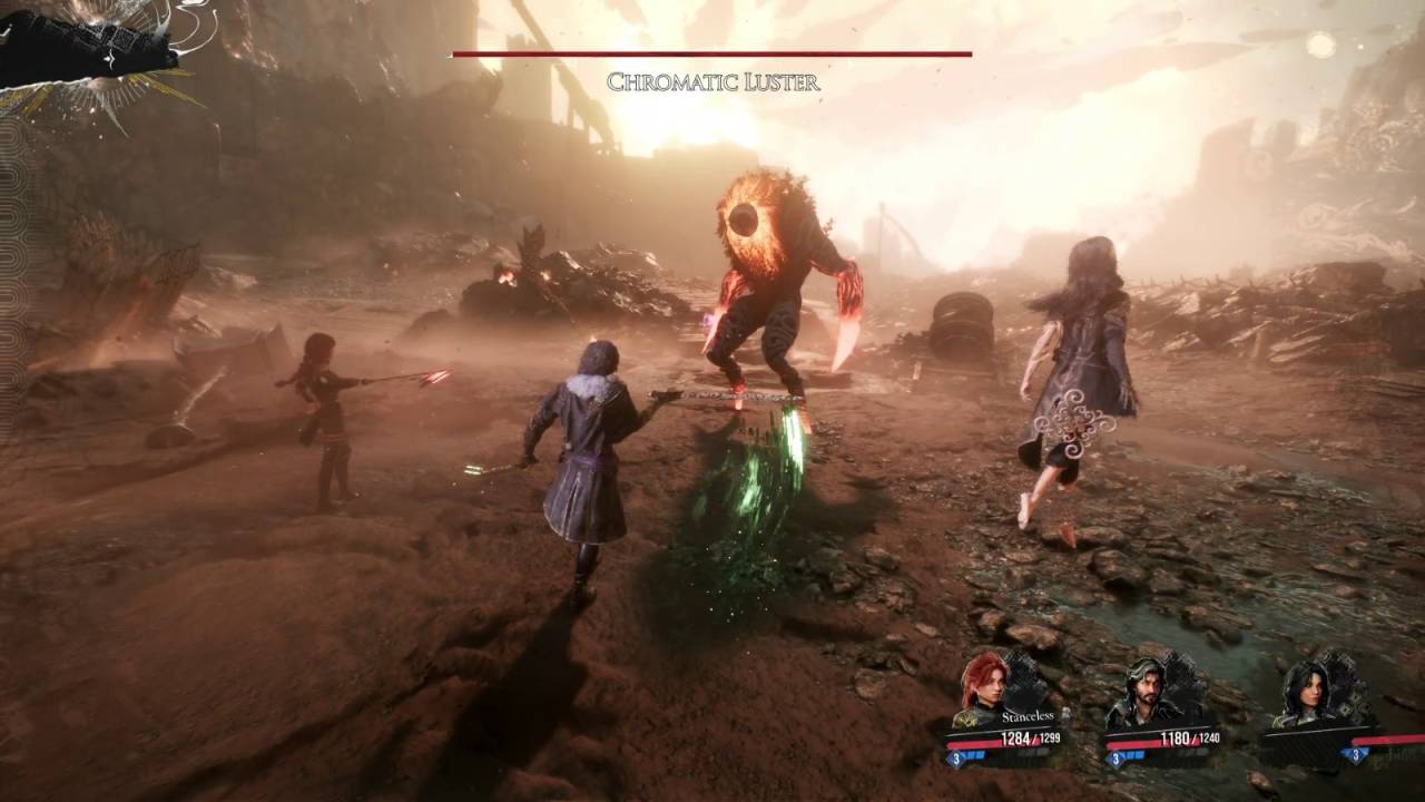 Этот враг похож на обычного люстера, но он использует для атаки огненную стихию и имеет несколько уникальных приёмов. Бой не особо сложный, но может затянуться, если вы не сможете парировать удары и не справитесь с дебаффами противника. Босс поглощает урон огнём — используйте другие элементы, особенно молнию, к которой он уязвим. Желательно взять оружие с электрическим уроном и активно применять способности Люнэ, связанный с этой стихией. Главное в бою — управлять ожогами, которые наносят урон со временем и могут быть поглощены боссом для восстановления здоровья. Избегайте атак или используйте очищающие способности, такие как «Исцеляющий свет» Люнэ или Версо.