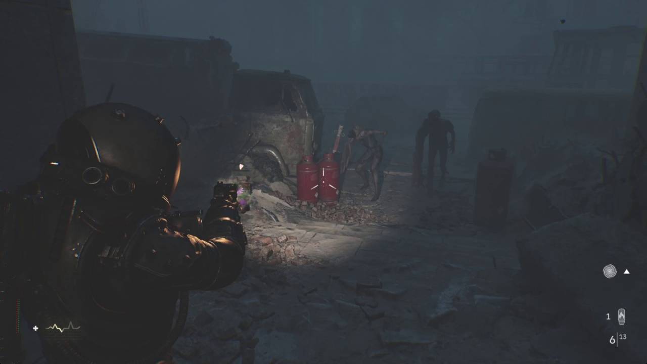 Продолжите движение по железной дороге, следуя в область ниже. Двигайтесь до самого конца в правую сторону, чтобы увидеть под полотном следующую аномалию. Выстрелите в неё, а затем посмотрите, куда сдвинулся обломок, чтобы обнаружить вторую аномалию. Выстрелите в неё, чтобы открыть проход дальше. Перейдите на другую сторону нового моста, а затем спрыгните на площадку ниже. Следуйте по заданному пути, и окажетесь в переулке с телами и биомассой. Когда доберётесь до дальнего конца, вас атакует группа Сирот (я насчитал порядка четырёх мобов). Используйте красные бочки в районе и вернитесь на тропу, по которой сюда пришли, чтобы добить выживших.