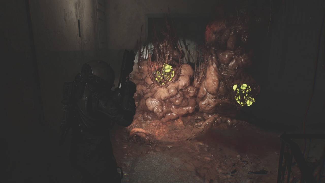 В общем стреляйте по ним с безопасного расстояния. Расстреляйте первые несколько цист на вершине лестницы, а после того, как свернёте за угол, можете выстрелить в бочку на расстоянии, чтобы уничтожить сразу несколько сгустков, а также барьер из биомассы за ней. Когда будете проходить мимо барьера, будьте осторожны с хорошо спрятанной цистой справа. Здесь же, в углу, ищите документ «Что, если?».
