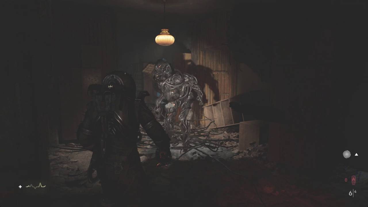 После победы над боссом обыщите его труп, чтобы получить 1000 единиц энергии, и быстро пройдитесь по квартире, собрав все необходимые материалы для крафта, боеприпасы или медикаменты. Выйдите из квартиры через другой выход. Когда доберётесь до края платформы, посмотрите вверх-вправо, чтобы увидеть аномалию. Выстрелив в неё, вы создадите мост. На другой стороне рядом с вешалкой есть документ «Ужасные вещи».