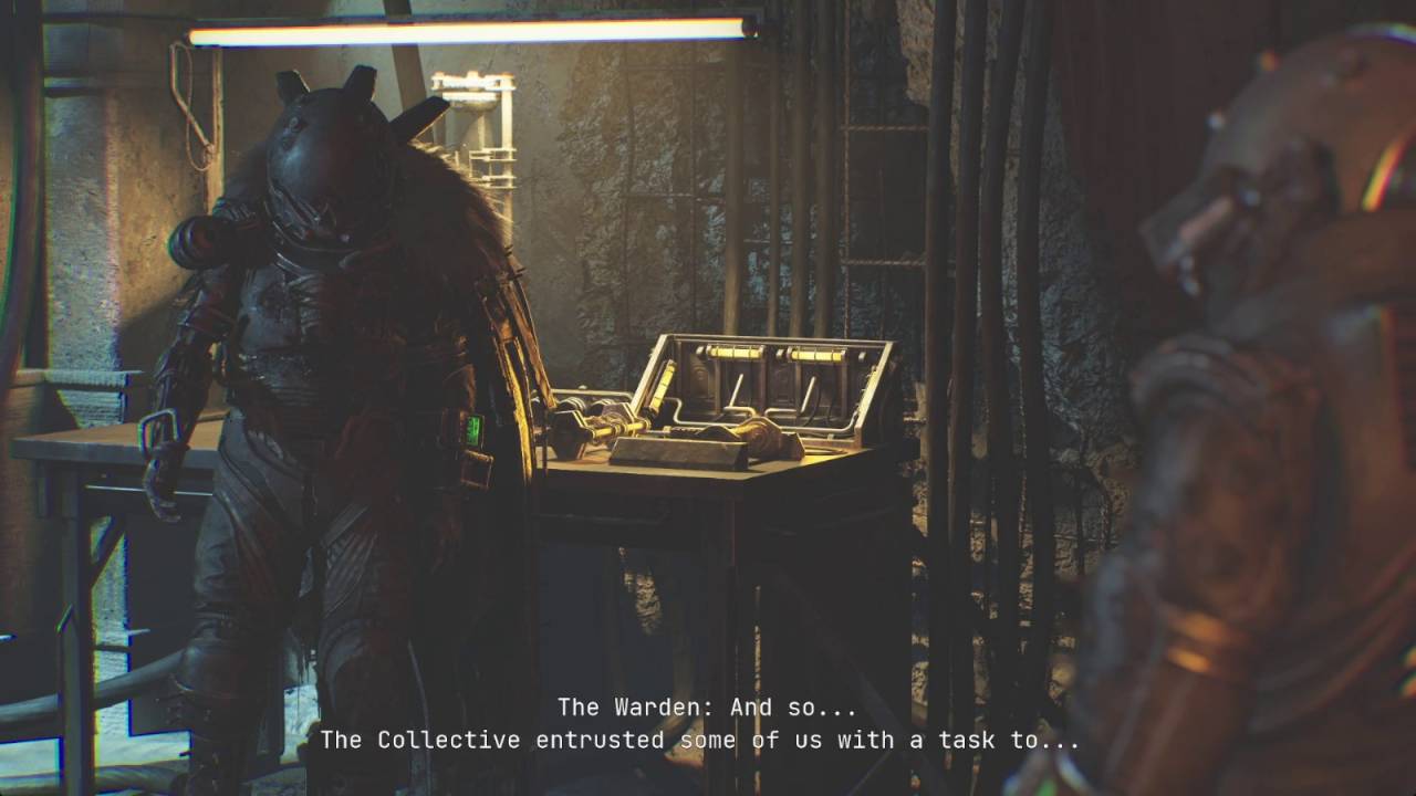 После этой кат-сцены вы очнётесь в новой комнате. Здесь собраны все поглаженные вами кошки (всего их в игре 10). На столе с правой стороны лежит документ «Провода и шипы». Пройдите через следующую дверь, чтобы попасть в хаб игры. В этом месте есть точка сохранения «Терминал», автомат с горючим для факела, тайник, рабочая станция и шкафчик с малым ремкомплектом. Пройдите через следующую дверь, чтобы вернуться к Терминалу. При входе запустится кат-сцена, в которой вам представят нового NPC Смотрителя. Он даст Якорь. После кат-сцены можете ещё раз поговорить со Смотрителем, чтобы узнать немного больше о его предыстории (необязательно).