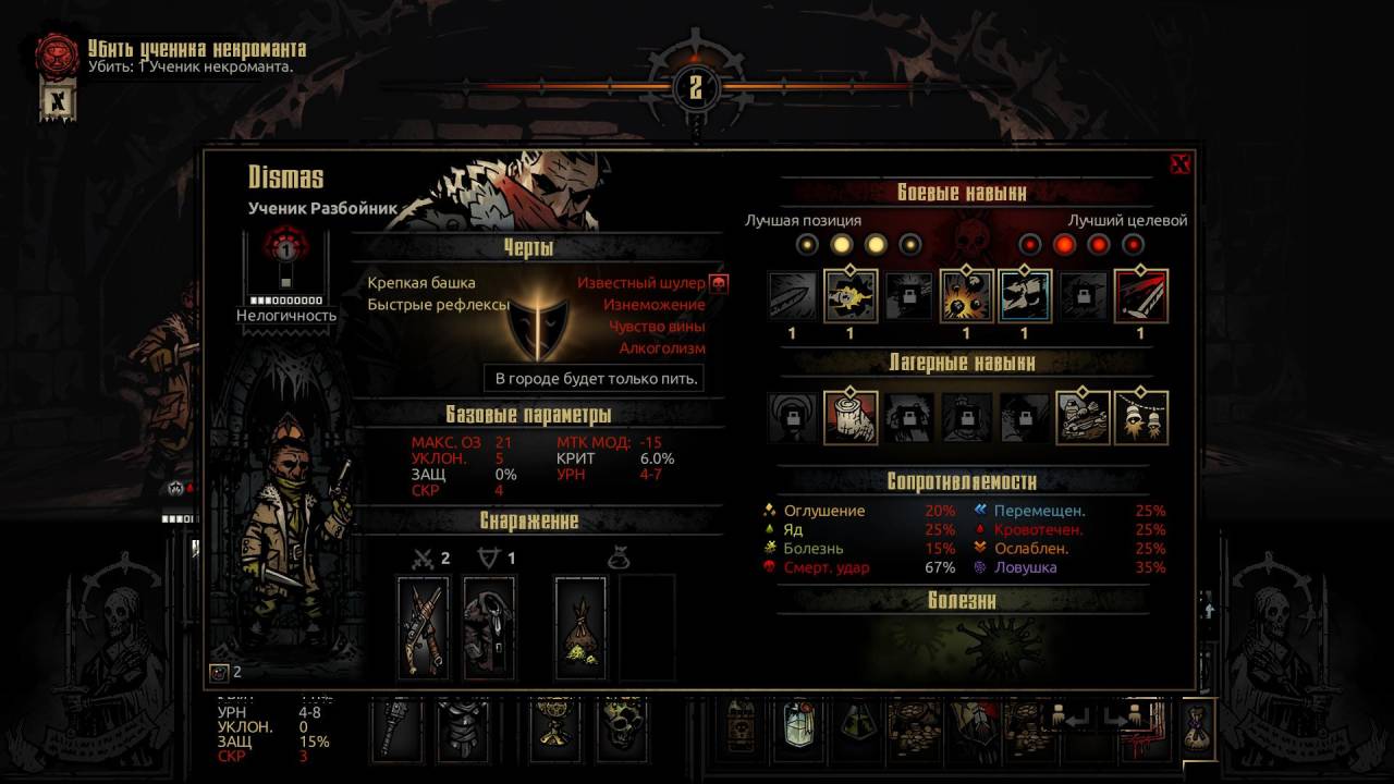 В Darkest Dungeon у персонажей тоже есть не только положительные, но и отрицательные врождённые черты вроде алкоголизма (персонаж снимает стресс только выпивкой), клептомании (ворует найденные нами денежки из сундуков), одержимости чистотой, едой, святостью, чувством вины и т. д.