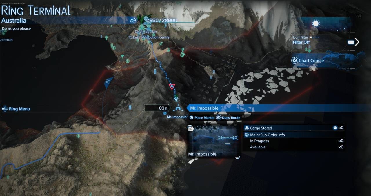 Когда можно разблокировать: чтобы подключиться к Мистеру Невозможности, вам придётся подобрать его утерянный груз. На протяжении всей игры доступно всего несколько грузов, обычно спрятанных в труднодоступных местах. Ближайший утерянный груз можно найти на скалах вокруг смоляного озера, прямо к северу от его местоположения. Два других места находятся на вершине горного хребта около Авиационного инженера и на небольшом острове с западной стороны моста у Пограничного форта F8. После того как принесёте один предмет, Мистер Невозможность разместит дополнительный заказ. Как только его выполните и вернёте необходимые предметы, убедите выживальщика подключиться к хиральной сети.