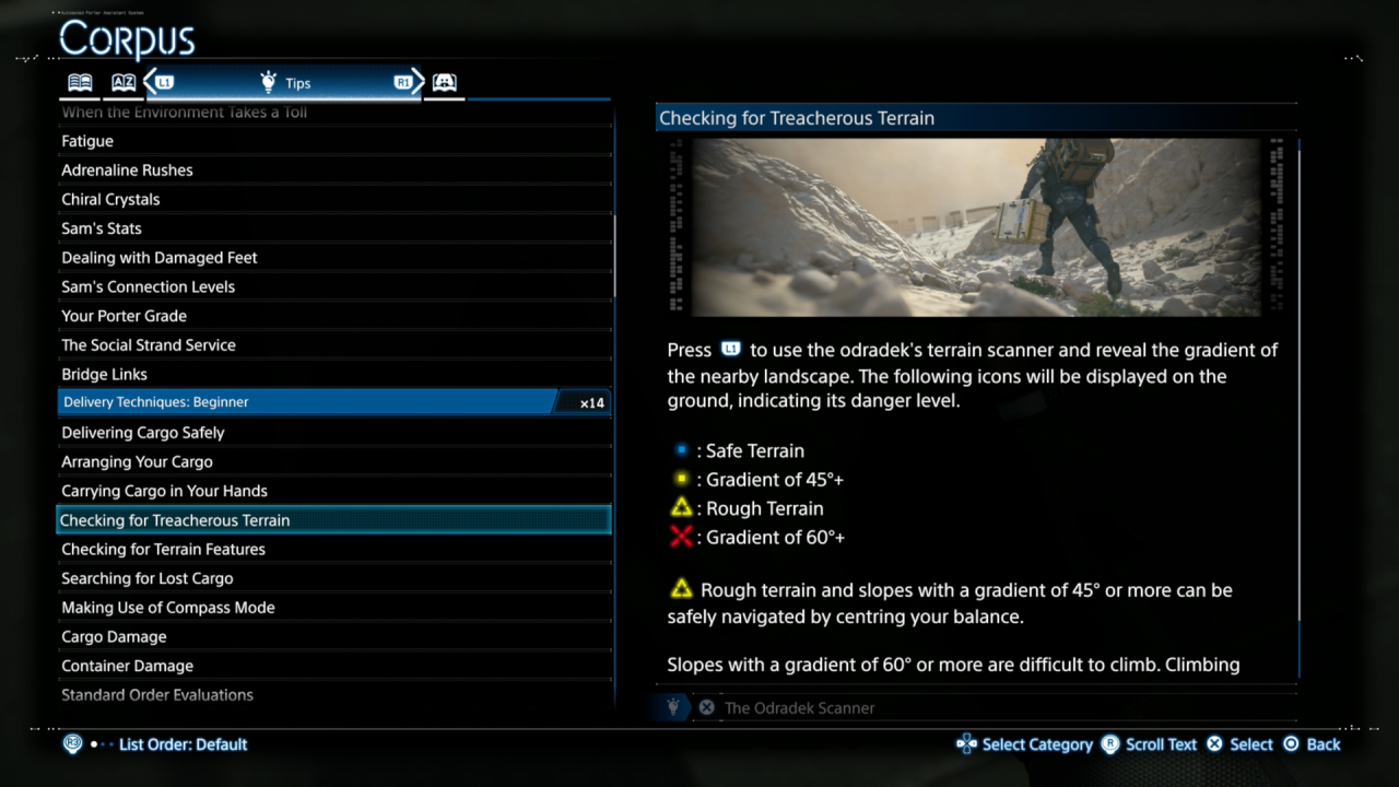 В Death Stranding 2: On the Beach есть обширный список внутриигровых подсказок, но многие из них скрыты в туториалах или мелькают на экране так быстро, что их легко пропустить. К счастью, существует простой способ просмотреть эти подсказки — открыть систему Corpus. Это внутриигровая энциклопедия, где собраны описания и советы по всем механикам, и их можно сортировать так, чтобы в первую очередь показывались новые, ещё не прочитанные подсказки. Если сомневаетесь в каком-то механизме — работе монорельсов или поиске безопасного пути через вражескую базу — ответ, скорее всего, можно найти в меню подсказок. Записи в справочнике, будь то подсказки или общая информация о персонажах и миссиях, добавляются очень часто, так что после каждой миссии проверяйте обновления, особенно в начале игры.
