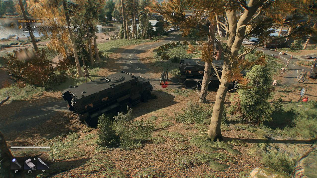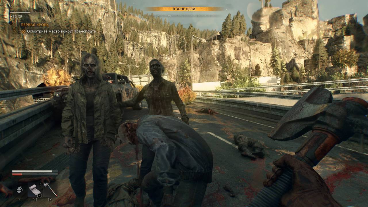 В целом геймплей предельно знакомый. Бегаем, прыгаем, иногда крадёмся, ломаем черепа и отсекаем руки-ноги с помощью лопат, топоров, труб и гаечных ключей. Иногда гоняем на машине, прокачиваемся, зачищаем безопасные зоны, выполняем много основных и побочных квестов. Периодически участвуем в рандомных событиях, когда нужно спасти выжившего — отбить бедолагу от монстров или дать ему аптечку (хотя это может быть и ловушка).