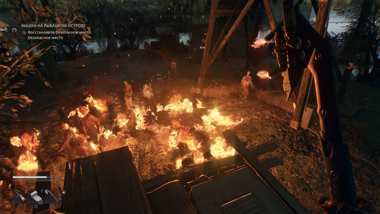 ИИ заражённых вроде бы должен был мне поддаваться — они ведь зомби, — и можно привести примеры глупого поведения. Но при этом полно довольно резвых и умелых противников, которые пытаются окружать и уклоняться от наших ударов, плюются чем-то мерзким или, например, взрываются. Я уже не говорю про бандитов и подельников Барона — именно ради них в игру вернули огнестрел.