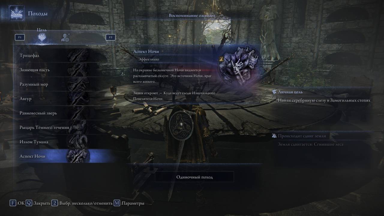Вы можете отправиться в экспедиции у места благодати на Круглом Столе, расположенном в центре крепости. Меню Экспедиции включает две вкладки. На первой вы выбираете Повелителя Ночи, против которого хотите сразиться, и запускаете экспедицию. Если хотите выбрать нескольких боссов, используйте X (или квадрат на PlayStation), чтобы отметить всех нужных. На второй вкладке вы можете переключаться между одиночным и многопользовательским режимами или собрать команду, пригласив друзей. Также здесь перед началом вылазки отображаются личные цели для воспоминаний и события «Сдвига земли».