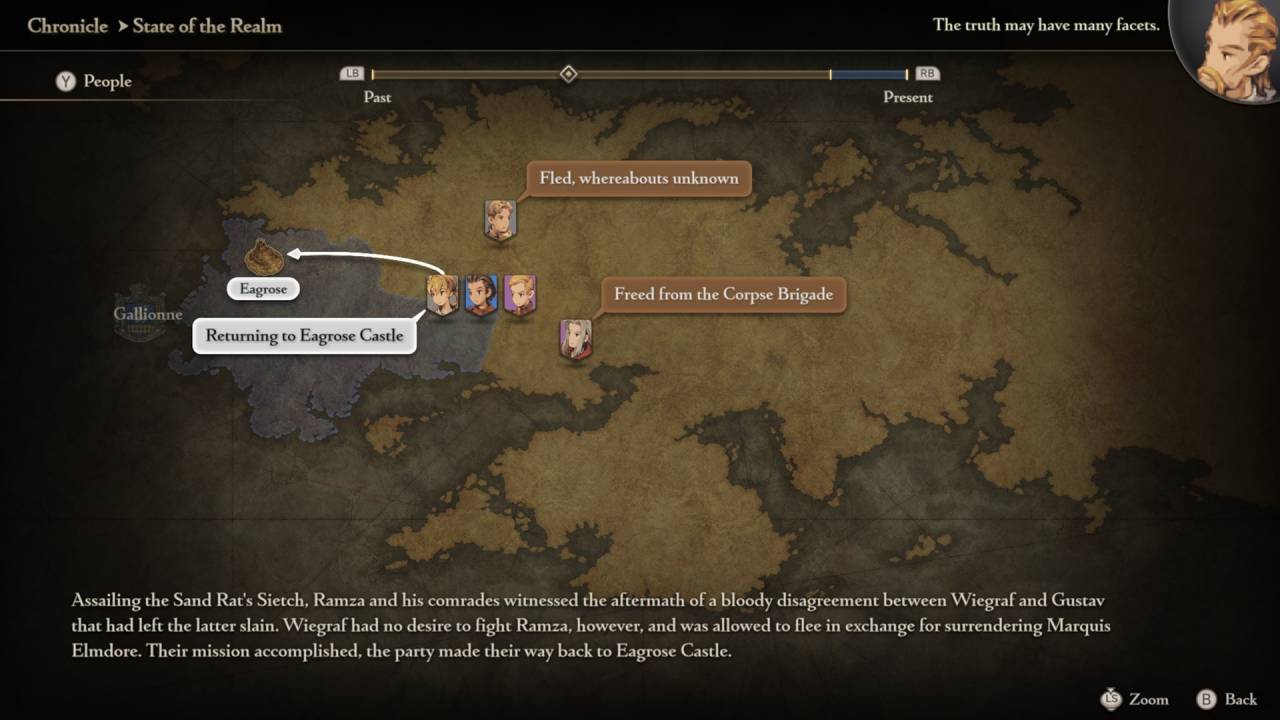 Хотя основная история не изменилась, небольшие модификации в неё внесли: местами переписали диалоги, чтобы с учётом озвучки они были менее перегруженными, местами добавили реплики — если в оригинале персонажи молчали при присоединении к отряду, то в ремейке могут что-нибудь сказать в подходящий момент. Для тех, кому эти нововведения не по душе (пусть их и одобрил Мацуно), в главное меню добавили возможность поиграть в оригинальную Final Fantasy Tactics — она запускается отдельно, со своими файлами сохранения. Но в таком случае теряешь доступ к другим особенностям ремейка — в частности, к разделу State of the Realm, где на карте мира показывают действия персонажей и вкратце пересказывают содержание последних миссий. Удобная «фишка» для путающихся в именах и событиях, особенно если возникают трудности с немного «шекспировским» английским в диалогах.