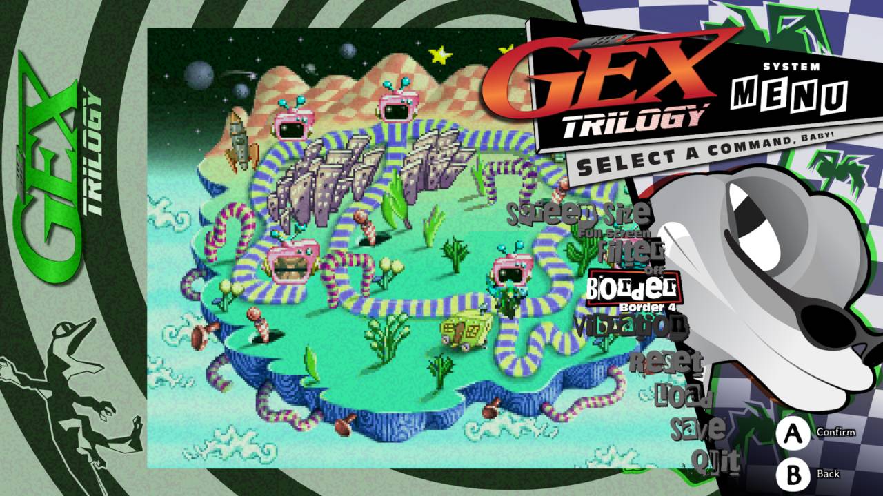 Короче говоря, игры хорошие и прошли проверку временем — осталось понять, что сделали с ними в Gex Trilogy. А сделали, к сожалению (или к счастью), очень мало. К примеру, если в ремастере Croc: Legend of the Gobbos перерисовали текстуры и позволяют свободно переключаться между старой и новой графикой, то тут над визуальной составляющей не работали вообще. Разве что добавили поддержку широкоформатного режима, вот только если его выбираешь, то картинка растягивается — довольно сильно в первой игре и менее заметно во второй и третьей. Ну и про ЭЛТ-фильтр не забыли, хотя он получился хуже, чем в других подобных переизданиях.